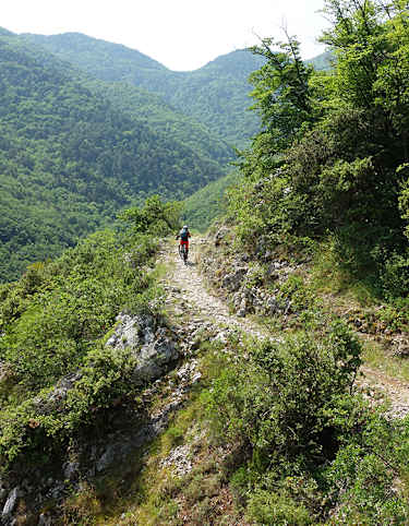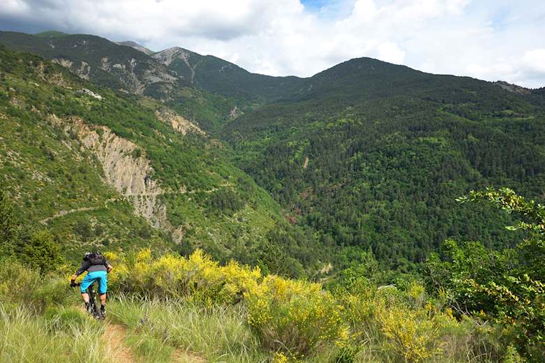 Die Abfahrt zur Pont des Roberts beginnt mit einer kurzen Abfahrt über die D 76 bis zur ersten Kehre unterhalb des Orts (1.278 m). Ab der Kehre folgt man dem Weg zum Roche Trouée, einem auffallenden Felsbogen. Dieser liegt kurz oberhalb von Wegpunkt 92 und ist in wenigen Minuten zu Fuß erreicht. Der Blick vom Felsbogen zum Var hinab ist großartig. Den Mont Richarmet (1.311 m) östlich umfahrend gelangt man zu Wegpunkt 90, unterhalb von Sauze Vieux – dem alten Sauze. Entsprach die Abfahrt bisher eher einer Querung, führt sie nun steiler bergab nach Osten zum Lauf des Var. An der Pont des Roberts gelangt man zur D 2202. Auf der Straße oder alternativ dazu auf der orographisch rechten Bachseite in wenigen Minuten zurück nach Guillaumes.