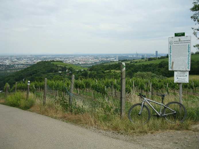 Mittelschwere Mountainbiketour vom Kahlenbergerdörfl über die Eiserne Hand auf den Kahlenberg (484 m). Diese Strecke ist kurz, aber knackig: Geht es doch unmittelbar vom Start im Kahlenbergerdörfl über steile Weinstraßen hinauf zur Eisernen Hand und von dort auf den Kahlenberg. Die Aussicht, die man schließlich von der Aussichterrasse des Hotels Kahlenberg auf die Weinberge, die Donau und das Wiener Becken genießt, entschädigt aber für die Mühe. Insgesamt eine konditionell fordernde, aber aussichtsreiche und als schnelle Trainingstour einzigartige Mountainbiketour in den Weinbergen am Nordrand von Wien.