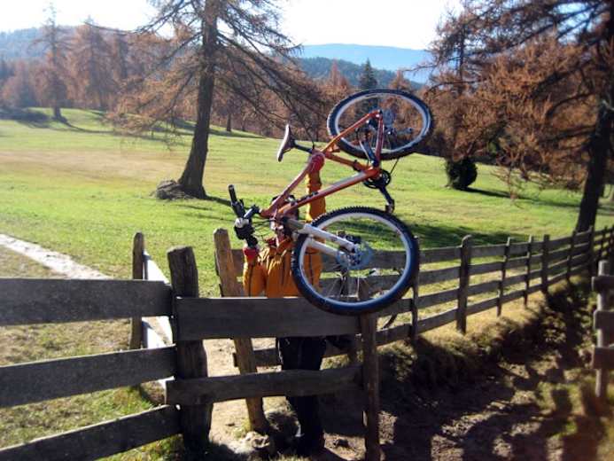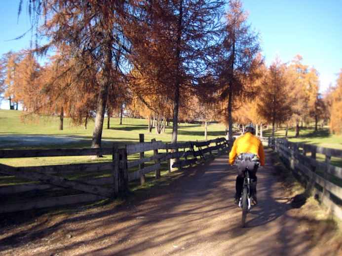 Das Dorf Jenesien selbst durchquert man und fährt, immer mäßig ansteigend, weiter bis zum Gasthof Edelweiss. Hier endet der asphaltierte Fahrweg und man folgt dem Fernwanderweg E5 auf gutem Terrain weiter in Richtung „Langfenn“ bis zum Gschnofer-Stall. Am Hochplateau des „Salten“ mit seinen Lärchenwiesen und seiner Ausdehnung kann man öfters eine kleine Verschnaufpause einlegen und das atemberaubende Panorama in die Dolomiten und in die Brenta genießen. Gerade im Herbst, wenn die Luft klar und die Berge zum Greifen nah sind, dann möchte man gar nicht mehr gerne ins Tal fahren.