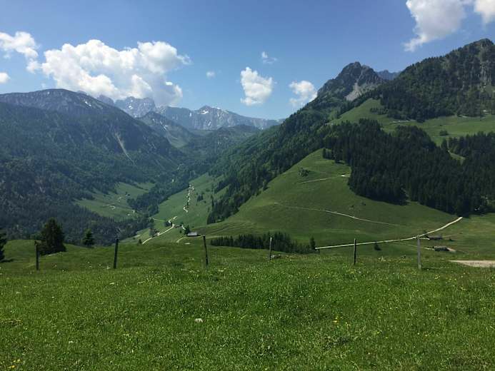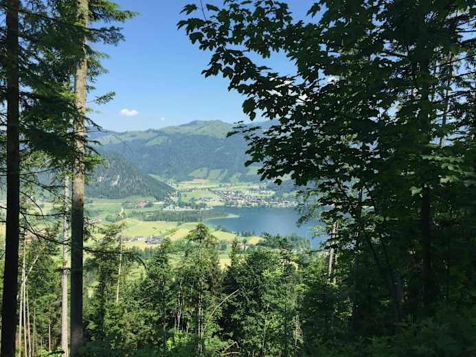Bei der Kreuzung links, und dann gleich wieder rechts Richtung Raineralm. Entlang des Weißenbaches durch das Habersauertal auf die Habersaualpe. Über die Gwirchtalm zur Südseite des Walchsees und zurück den Schildern folgend in den Ort.