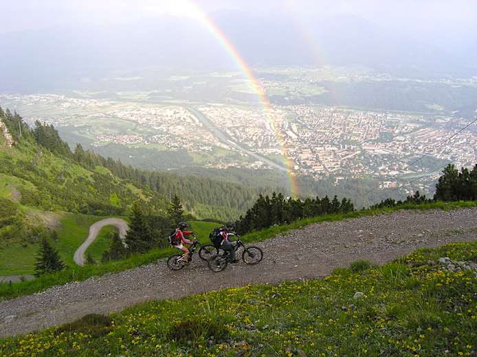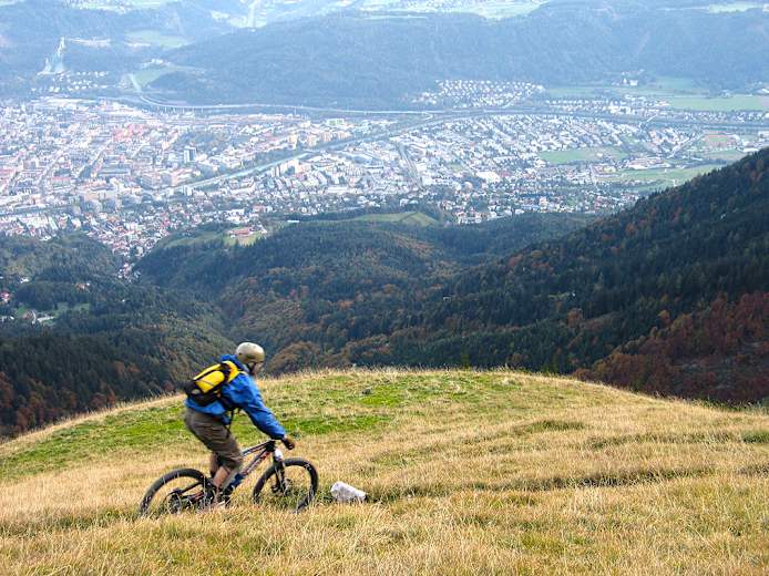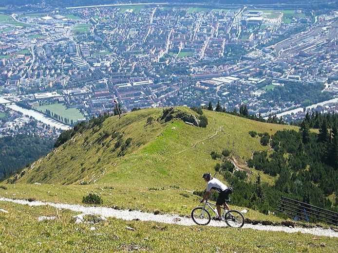 Variante für Downhill-Freaks und Experten: Steil bergab mit ständigem Panoramablick auf Innsbruck geht's von der Seegrube auf dem Singletrail.