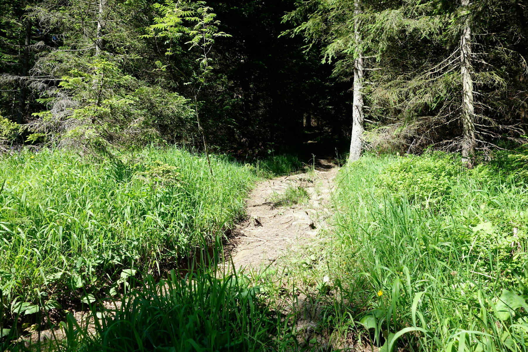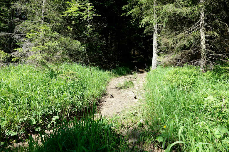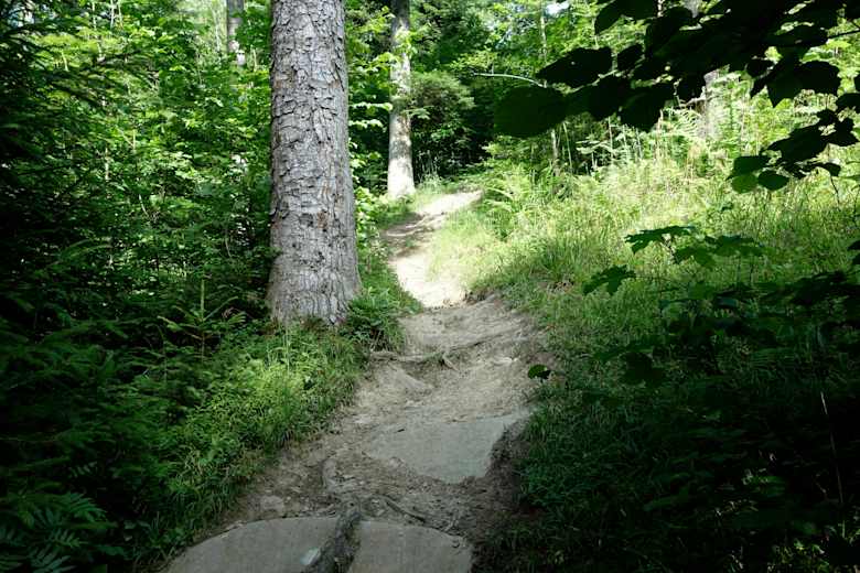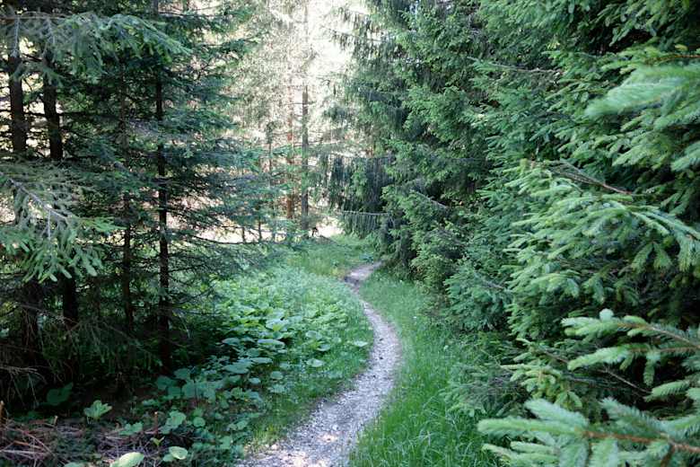 Zunächst rollt man ein paar Meter retour auf der Straße. Aufmerksam sein: Der Traileinstieg ist leider schlecht erkennbar und nicht ausgeschrieben. Kurz vor der 500 Meter Straßenmarkierung geht es links in den Wald. Dann beginnt der Abfahrtsmix: Wald- und Wiesenwege, ausgefahrene Holzpfade, Platten, Stufen, Wurzeln und Bachläufe. Teils ist der Trail rumpelig, aber schnell zu fahren. Im letzten Drittel gibt es zwei, drei technischere Passagen über Wurzelstufen, wo man ruhig auch mal absteigen kann (aber nicht über den Lenker!). Die Route ist kein ausgeschriebener Wanderweg und auch nicht verzeichnet, deshalb Augen auf im Wald und kreativ sein bei der Linienwahl. Nach ca. 3 km gelangt man wieder auf die bekannte Uphill-Strecke.