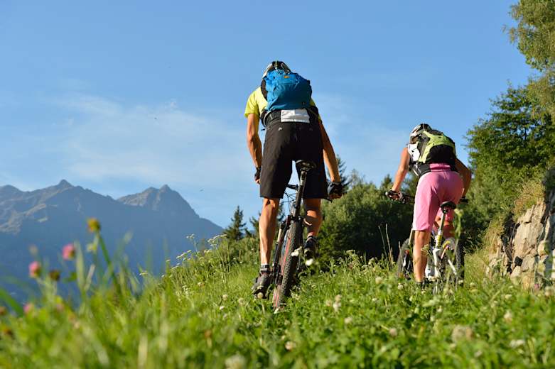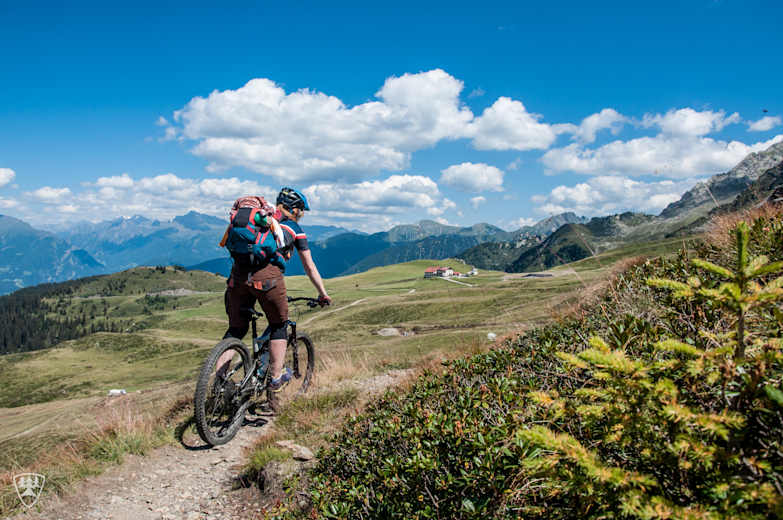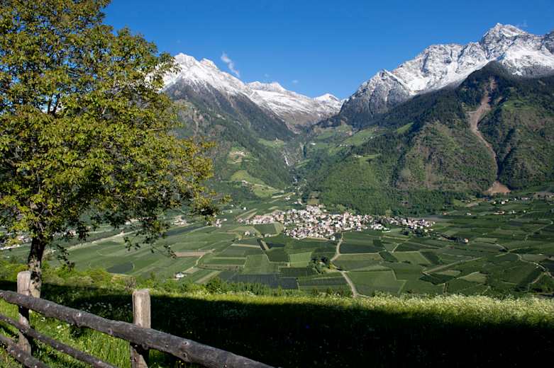 Die Tour führt zum Glück nur kurz entlang der Straße und zweigt nach der Bachquerung kurz vor der Jaufenalm rechts wieder in einen Wanderweg (Nr. 17) ab. Dieser führt bis zur nächsten Kehre mit Bushaltestelle. Hier zweigen wir parallel zur Straße nach links ab zum Jägerhof. Hier kann man entweder dem Wanderweg über die Wiese zum Radweg folgen, oder die Jaufenstraße ein kleines Stück zurückfahren um beim Gasthaus Grubenhof auf den Radweg zu gelangen. Etwas oberhalb des Tales zieht der Weg mit toller Aussicht durch das Waltental nach St. Leonhard hinunter. Nach mehreren Kehren und einem kurzen Stück schmalem Fußweg erreicht man den Ort. Von hier folgt man dem Passer Radweg bis nach Meran. Ein kurzer Espresso oder Venezianer am Hauptplatz ist empfehlenswert, bevor es das letzte Stück hoch zur Unterkunft in Algund geht.