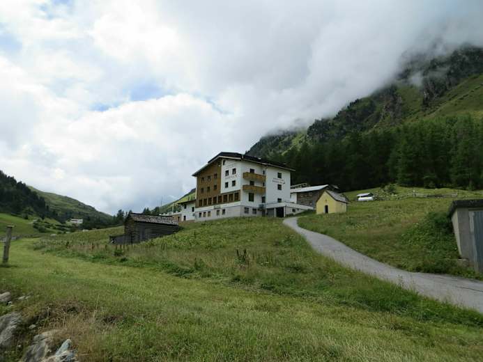 Dort geht es auf einem gut ausgeschilderten Radweg am Zeinisbach auf einem unbefestigten Weg bis nach Ischgl (1.476 m). Dann folgt man den Wanderschildern in Richtung Heidelberger Hütte und passiert die Padratschalpe (1.665 m) und dann die Bodenalpe (1.840 m) auf einer Teerstraße. Dann wird der Weg wieder zur Schotterpiste, die an der alten Zollwache teils steil hinaufführt bis zur Heidelberger Hütte (2.264 m) in der Silvretta. Hier kann man die Mittagspause genießen und gut essen, bevor es weiter über den Fimberpass (2.608 m) in die Schweiz geht.