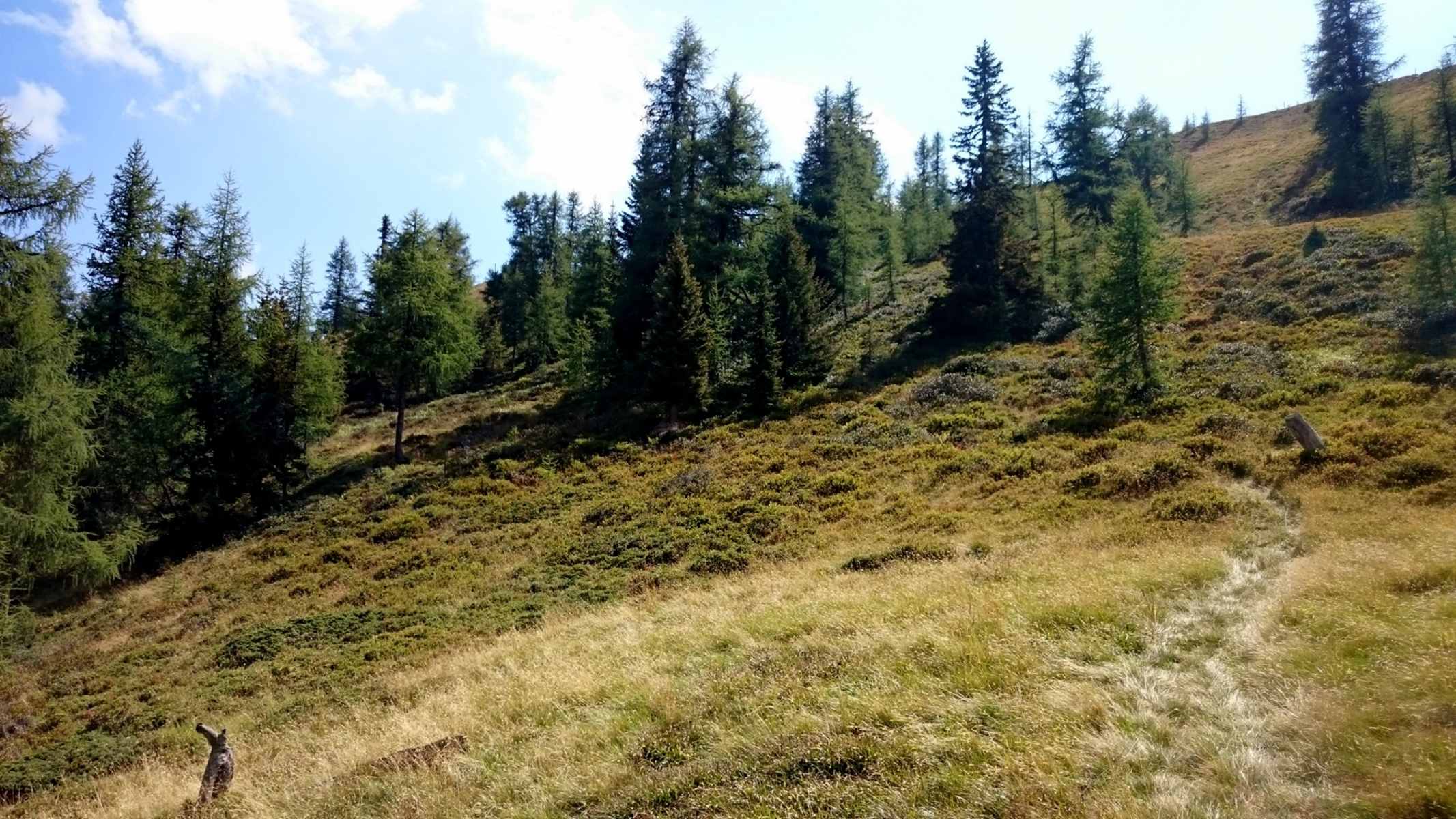Der Steig quert immer wieder die Forststraße, was es ermöglicht, immer wieder auf die Forststraße zu wechseln. Man gelangt zu der schon bekannten Wegkreuzung, wo man zum wunderschön gelegenen Speichersee abbiegt. Vor dem See, geht es linker Hand einen Schotterweg hinunter der an der Moosalm vorbei, unter der Sommerrodelbahn hindurch, zu einem Hof führt. Im Schritttempo, passieren wir den Hof und folgen der Asphaltstraße bis zum Gribele Hof.