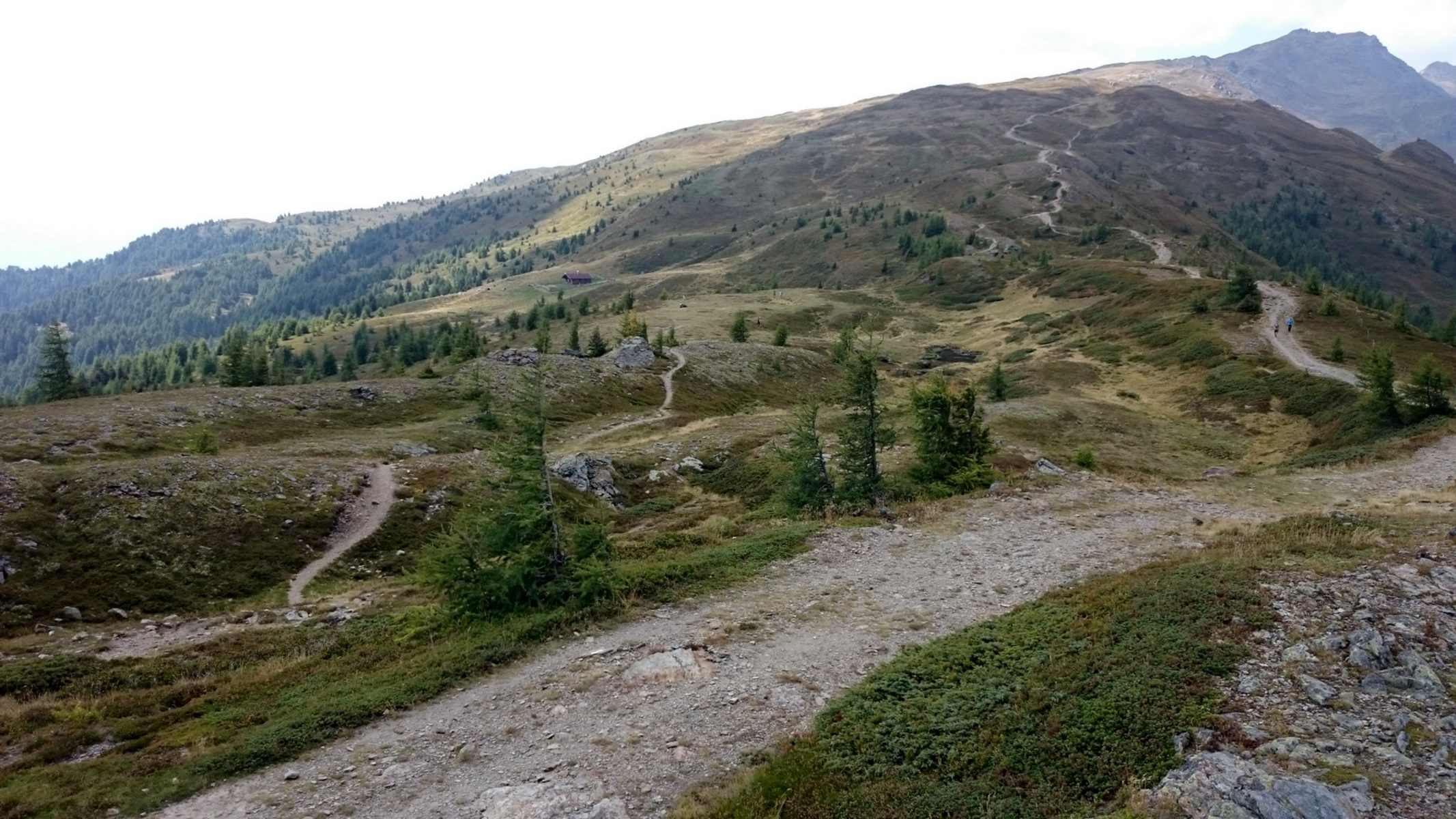 Gegen Ende lichtet sich der Wald und der Weg wird immer verwachsener. Gleich nach einer Kuppe geht es links einen unscheinbaren Trampelpfad hinauf. Nach gut 1.400 Hm in den Beinen fühlt sich das geschulterte Rad etwas schwerer an als gewöhnlich. Die letzten Meter sind wieder fahrbar, vorausgesetzt man hat noch genug Power und den nötigen Antritt. Am Hochsteinkreuz angekommen wendet man sich nach rechts und folgt dem breiten Wanderweg in Richtung Böses Weibele. Ein wunderschöner Single Trail führt zur Gampele-Hütte, die den Wendepunkt markiert. Ein Fahrweg führt zum Parkplatz der Hochsteinhütte, die wir nach kurzer Auffahrt erreichen.