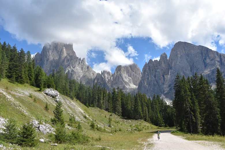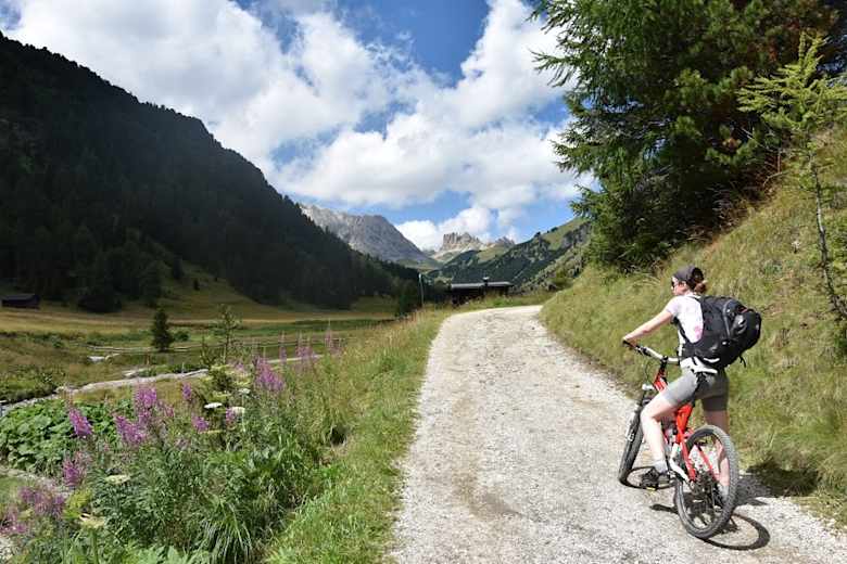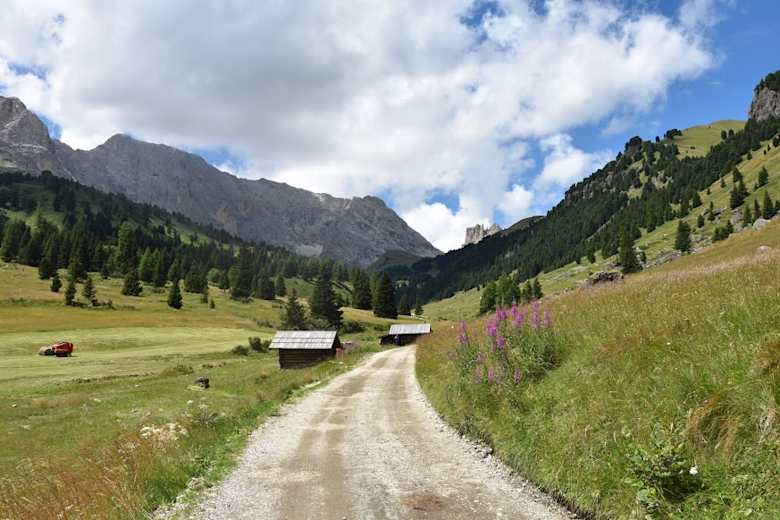 Den steilen Forstweg bis zur Baita Freines 1.610 m und dem Rifugio Micheluzzi 1.860 m, nun einige Kilometer mäßig bergauf durch das malerische Durontal, vorbei an der Lino-Brach-Hütte und den letzten steilen Anstieg bis zum Mahlknechtjoch 2.200 m, Abfahrt bis zur Kreuzung Dialer-Kirchlein dann rechts den schönen Panoramaweg Nr. 7 Richtung Zallinger, bei der Tomaseth-Schwaige kurz bergab fahren (der letzte Teil des Wanderweges ist den Wanderern vor behalten) und an der Abzweigung rechts auf Nr. 9 bergauf bis zum Berghaus Zallinger 2.050 m, 50 Hm bergauf zum Sattel, auf dem etwas ruppigen Forstweg Nr. 531 talwärts bis zur Abzweigung mit Bushaltestelle abfahren 1.820 m.