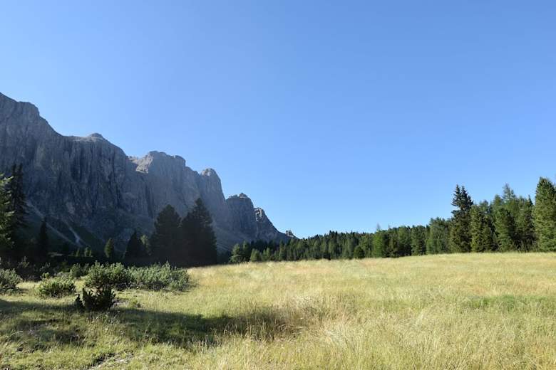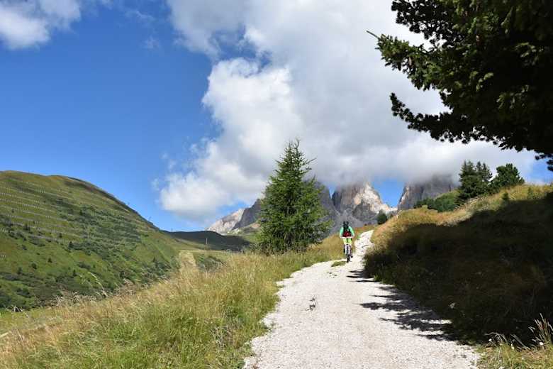 Rrechts talwärts Richtung St. Ulrich auf Nr. 30 bis Monte Pana 1.630 m, nach links auf dem Trail Nr. 30 Richtung Wolkenstein abfahren, Monte-Pana-Straße überqueren und auf dem Trail bis Wolkenstein zum Vereinshaus 1.550 m, den Bach taleinwärts bis zur Brücke, diese überqueren, auf der Straße 300 m Richtung Grödner Joch, links Richtung Dantercepies und rechts auf dem Radweg zum Sportplatz in Wolkenstein zum Ausgangspunkt zurück.