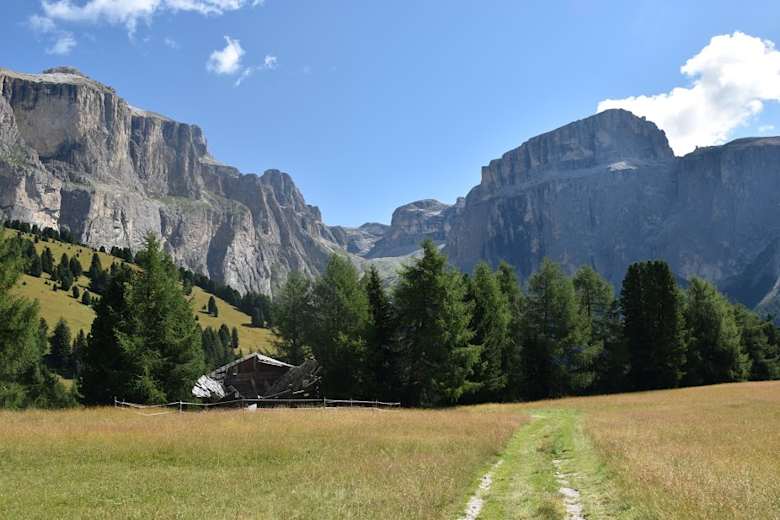 Start auf 1.600 m am Sportplatz in Wolkenstein. Auf der Grödner-Joch-Straße bis zur Talstation der Piz-Sella-Seilbahn 1.800 m, die steile Schotterstraße bergauf weiter auf Nr. 657 vorbei an der Malga del Sella 2.110 m, Richtung Sellajoch bis zum Sellajoch-Haus 2.170 m, (anspruchvoller Singletrail) kurz zum Rifugio Valentini 2.220 m, erste Abfahrt der Tour, nach der Baita Crepes de Sella bis zur asphaltierten Straße abfahren, weiter zum Albergo Lupo Bianco,nach ca. 100 m scharf rechts den Trail Nr. 655 bis nach Canazei