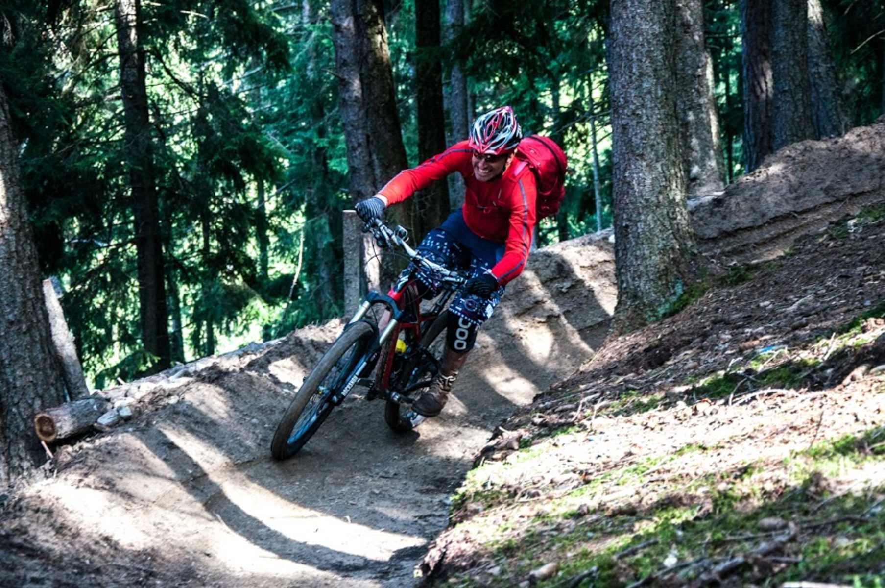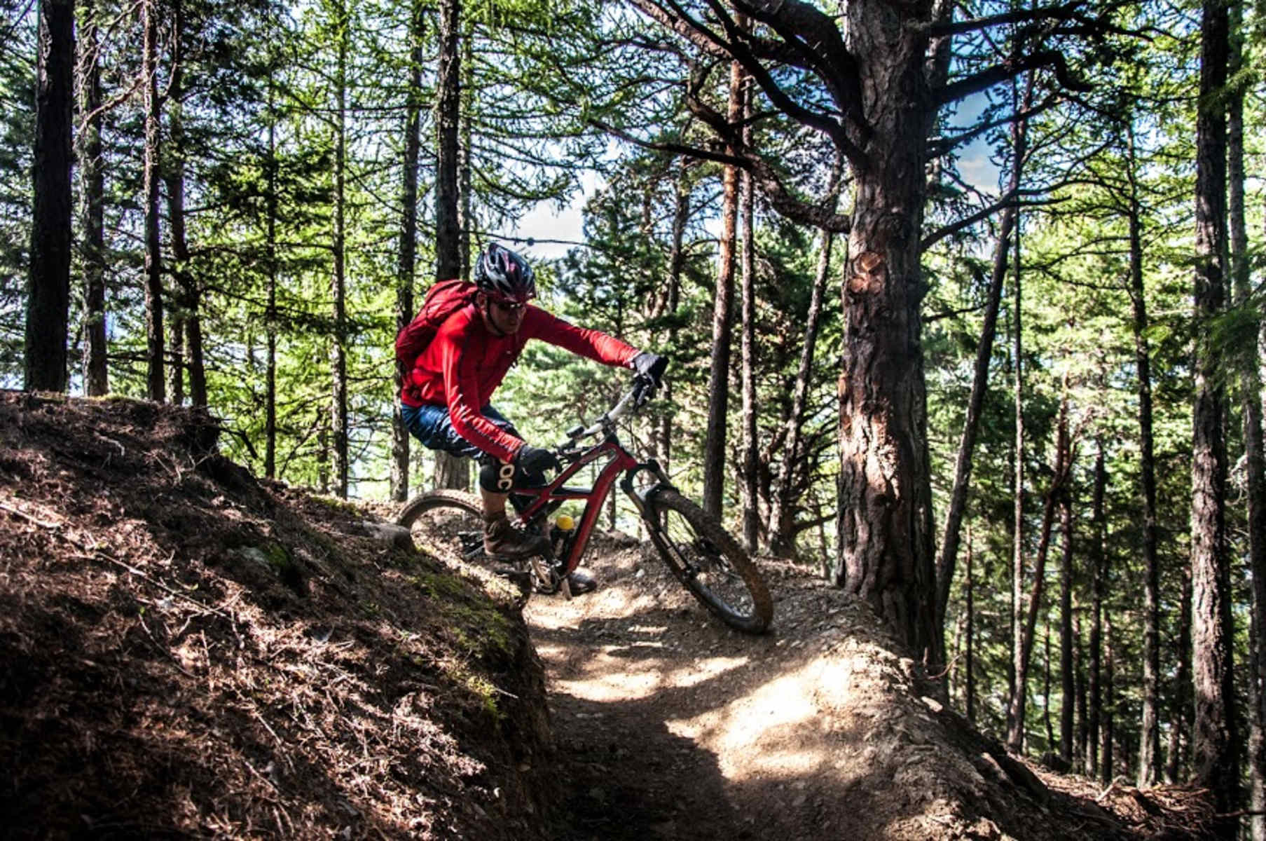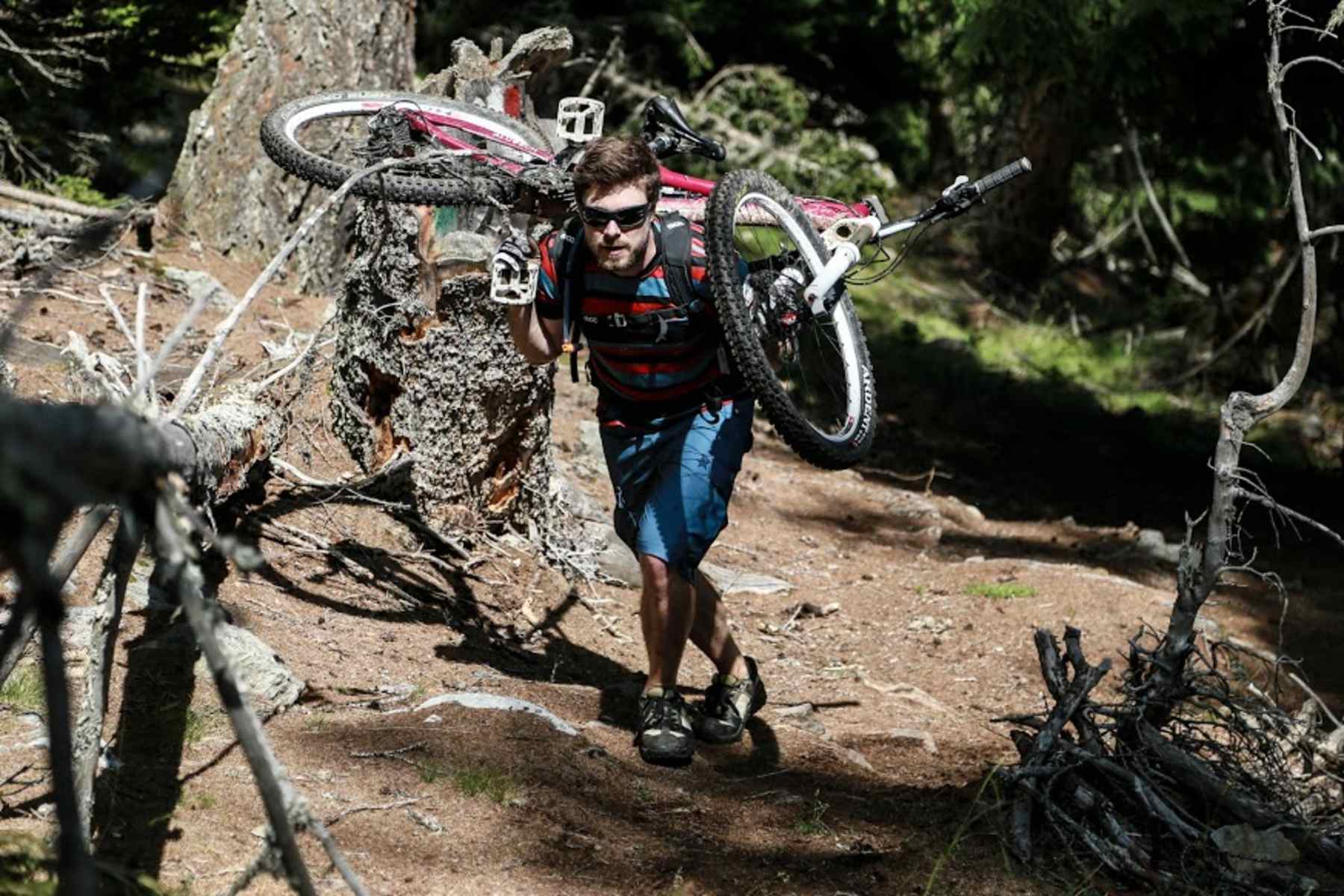 Nach einer anstrengenden Auffahrt auf Forststraßen heißt es Tragen oder Schieben, nur wenige Meter am Wanderweg kann man bergauf fahren. Selbst bei großer Motivation *g* Foto: Rene Sendlhofer Tragen oder Schieben ist angesagt bis zum Kreuzjöchl auf 2.053 m. Hier kommt Bike-Bergsteig Feeling auf. Foto: Rene Sendlhofer Im Hintergrund die 3.000er vom Martelltal. Foto: Rene Sendlhofer Knifflige Stellen am Weg zum Joch. Wer motiviert ist und Kraft hat, kann sich hier austoben. Foto: Rene Sendlhofer Der Holy Hansen 2, ein toll angelegter Trail vom Haslhof bis ins Tal. Foto: Rene Sendlhofer Zahlreiche Anlegerkurven und weitere Hindernisse erwarten dich während der Abfahrt. Foto: Rene Sendlhofer Bildergalerie (6)
