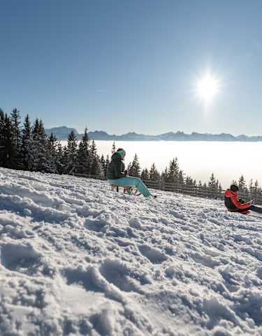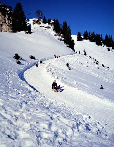 Entlang einer kurzweiligen, rasanten und abwechslungsreichen Rodelstrecke rodelt man hier in Bayern ins Tal hinab.