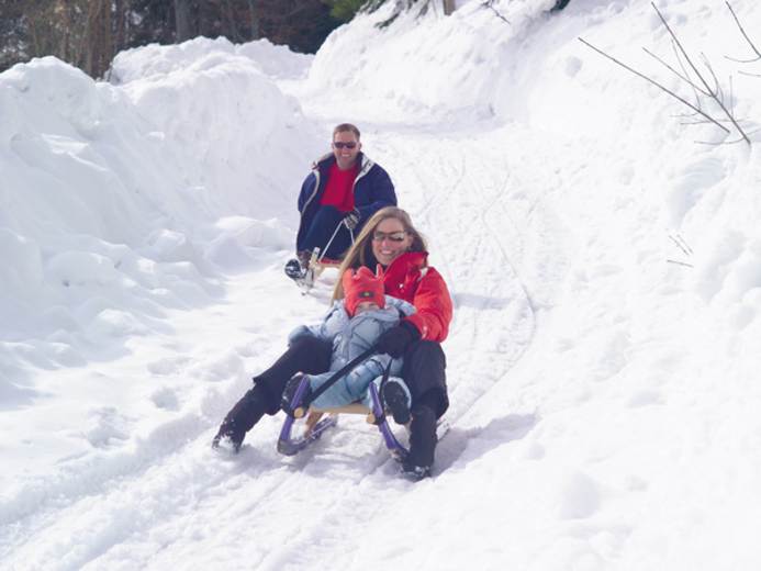 Zuerst auf der Rodel durch die tief verschneite Winterlandschaft und anschließend die bayrische Gastlichkeit genießen: Das geht auf der familienfreundlichen Naturrodelbahn Adlgaß bei Inzell in Oberbayern.