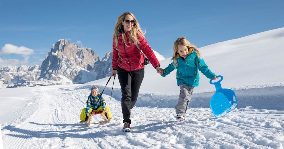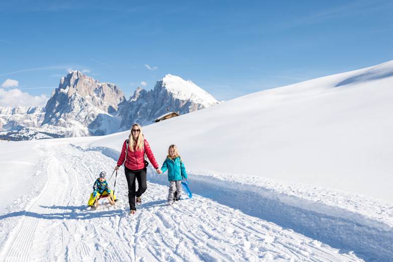 Die längste Rodelstrecke auf der Seiser Alm verlangt etwas Ausdauer und Können, bietet dafür aber jede Menge Rodelspaß und ein herrliches Panorama auf die umliegenden Dolomitengipfel.