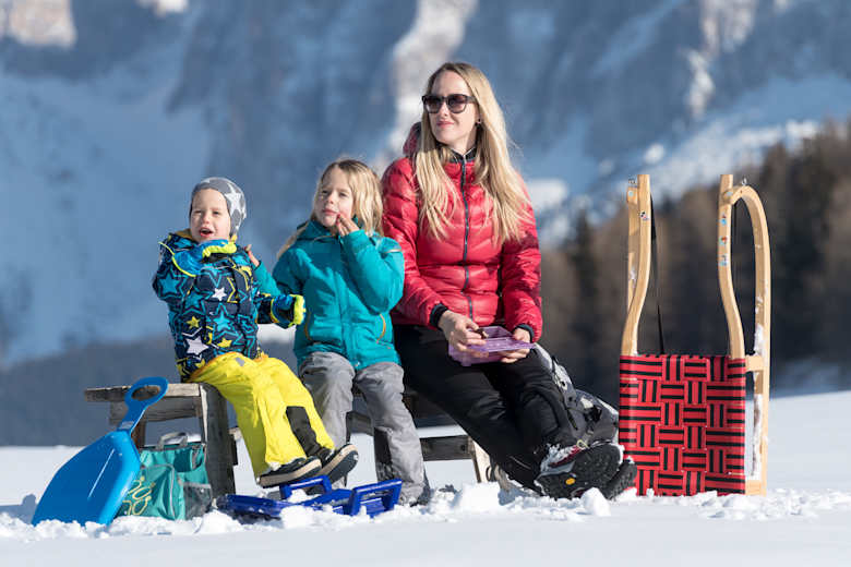 Die Hütten der Seiser Alm warten mit kulinarischen Köstlichkeiten aus der Region Südtirol auf. Beim Ziel der Rodelbahn, dem Völser Weiher, kann man Schlittschuhe ausleihen und auf dem zugefrorenen Weiher seine Eislaufkünste unter Probe stellen.
