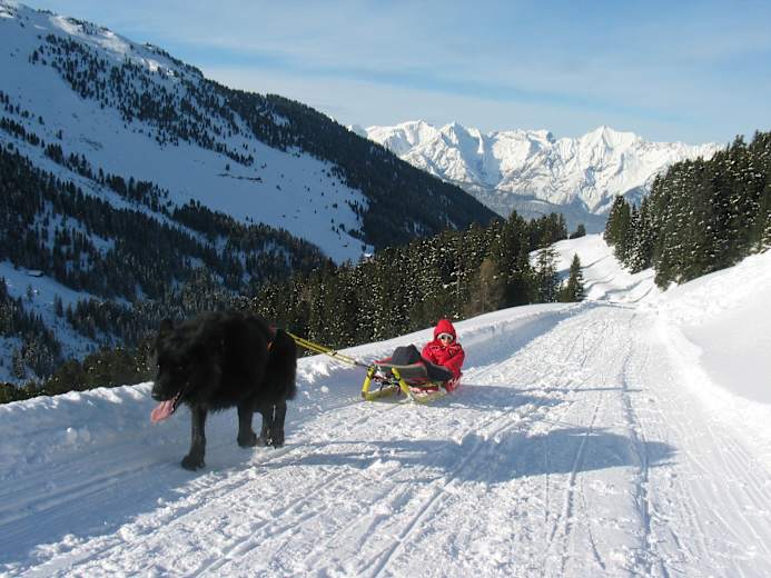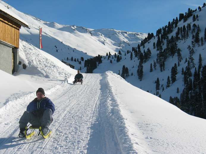 Besonders wenn die Sonne den Schnee zum Glitzern bringt ist diese Rodeltour im bereits alpinen Gelände ein herrliches Erlebnis für die ganze Familie.