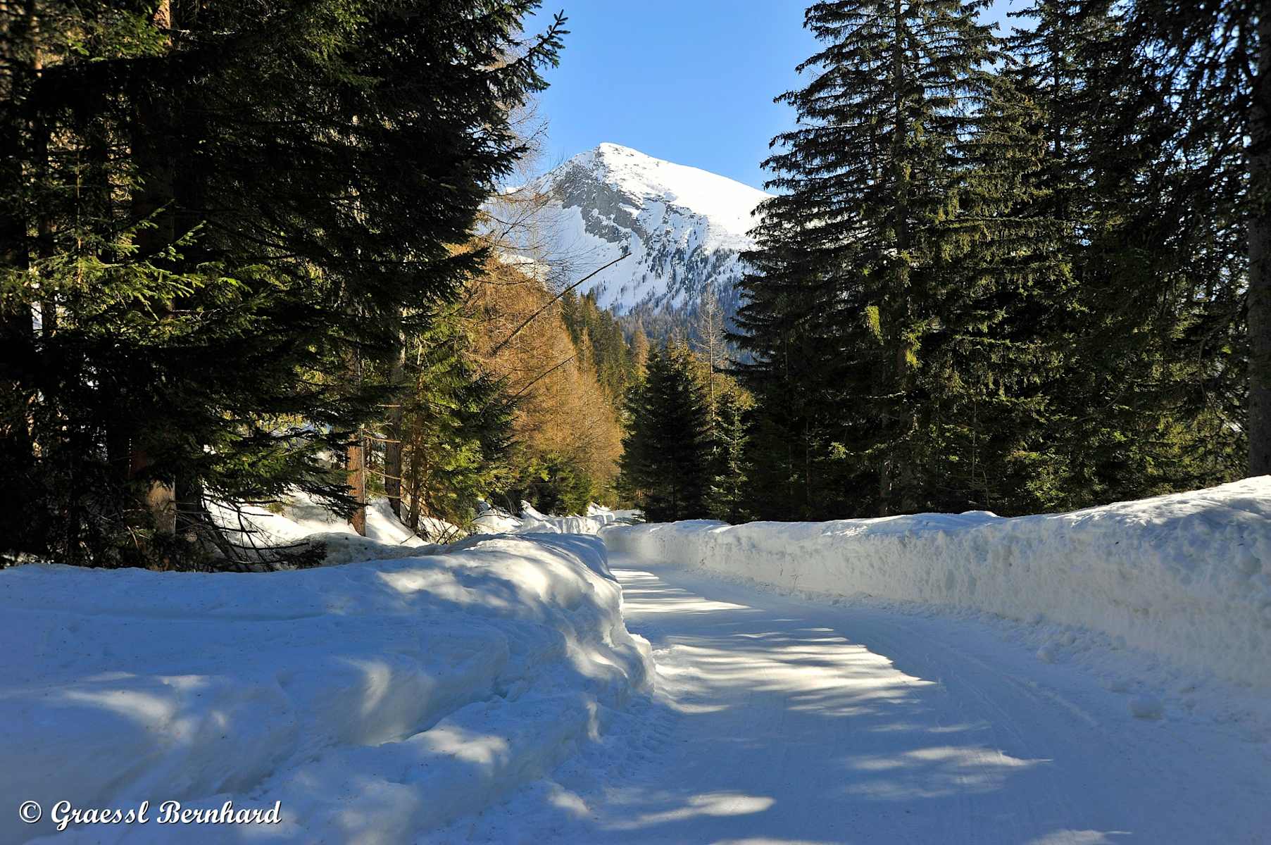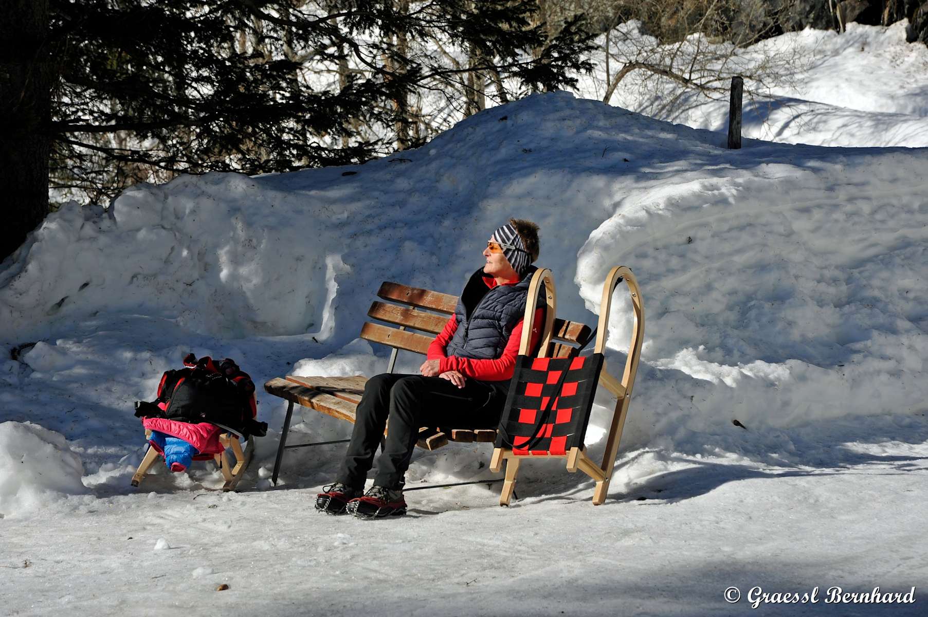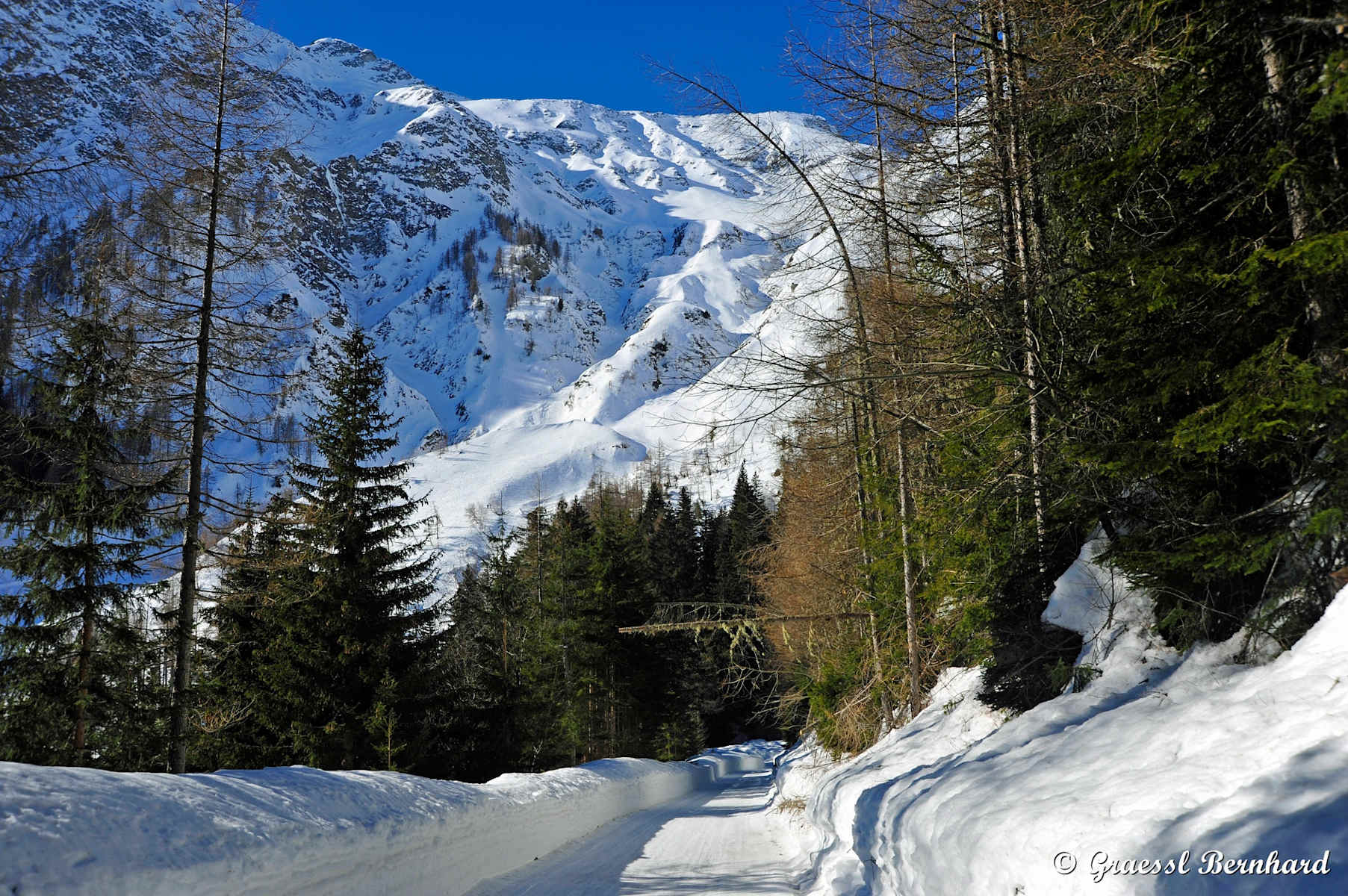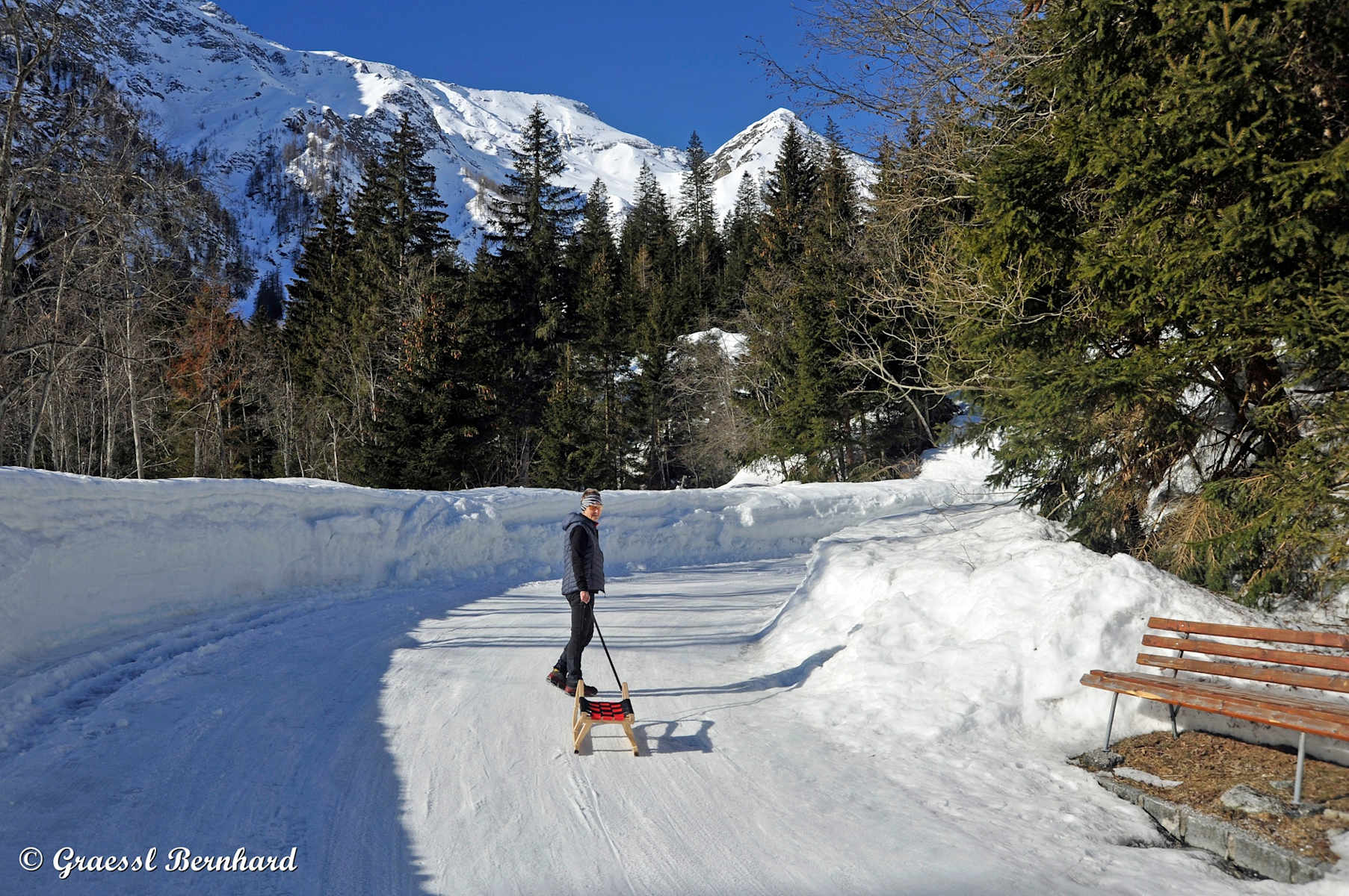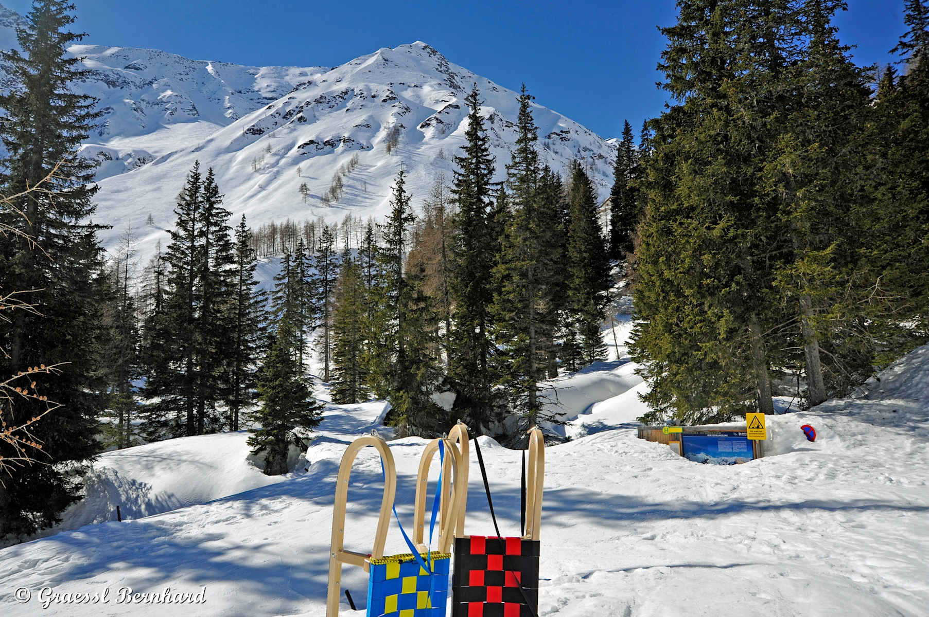 Die Zufahrtsstraße zur Jamnigalm dient im Winter als herrliche Rodelbahn. Die Straße ist für den individuellen Verkehr gesperrt und wird lediglich vom Skitouren- und Rodeltaxi befahren.