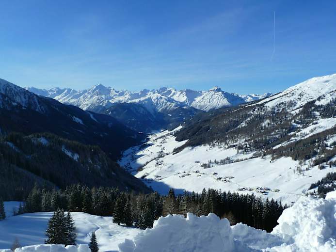 Sehr schöne Rodelbahn in den Tuxer Alpen in Tirol. Auch wenn es im Tal beim Parkplatz oft noch klirrend kalt ist, geht es über die Rodelbahn bald schon hinauf in die Sonne und zur neu umgebauten Naviserhütte auf 1.782 m.