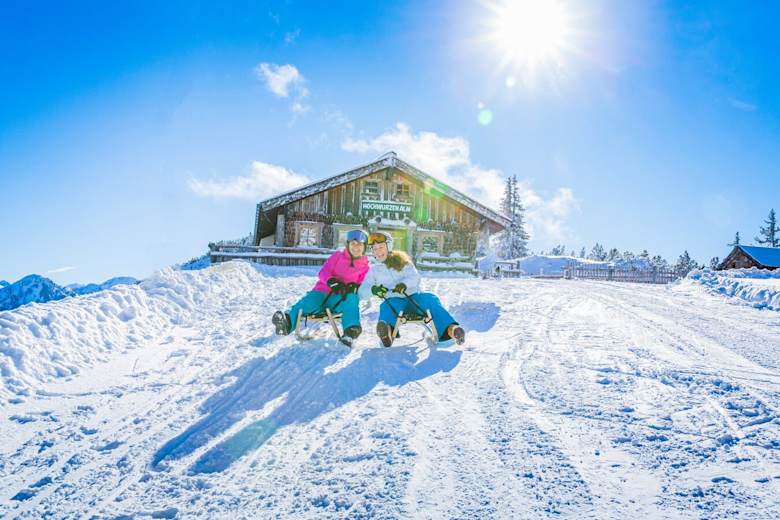 Der Aufstieg mit der Gipfelbahn Hochwurzen samt Rodel ist komfortabel und führt direkt auf den Hochwurzen-Gipfel (Startpunkt Rodelbahn), die Rodelbahn bringt Dich dann zurück zur Talstation, so dass sich gleich mehrere flotte Rodelpartien nacheinander ausgehen! In den Hütten – direkt an der Rodelbahn gut verteilt vom Startpunkt bis ins Ziel - ist auch ausreichend Platz für größere Gruppen. Vom Hochwurzen Gipfel bietet sich ein toller Panoramablick zum Dachstein-Massiv.