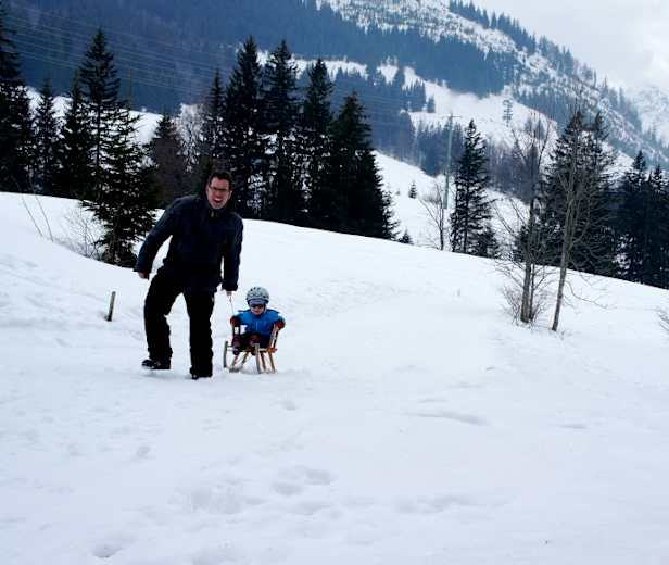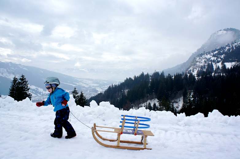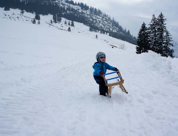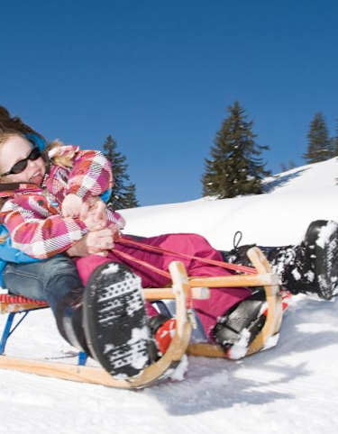 Die meisten Kinder sind mit dieser kurvigen Strecke fahrtechnisch überfordert. Deshalb ist es besser, zu zweit auf einem Schlitten Richtung Tal zu brausen.