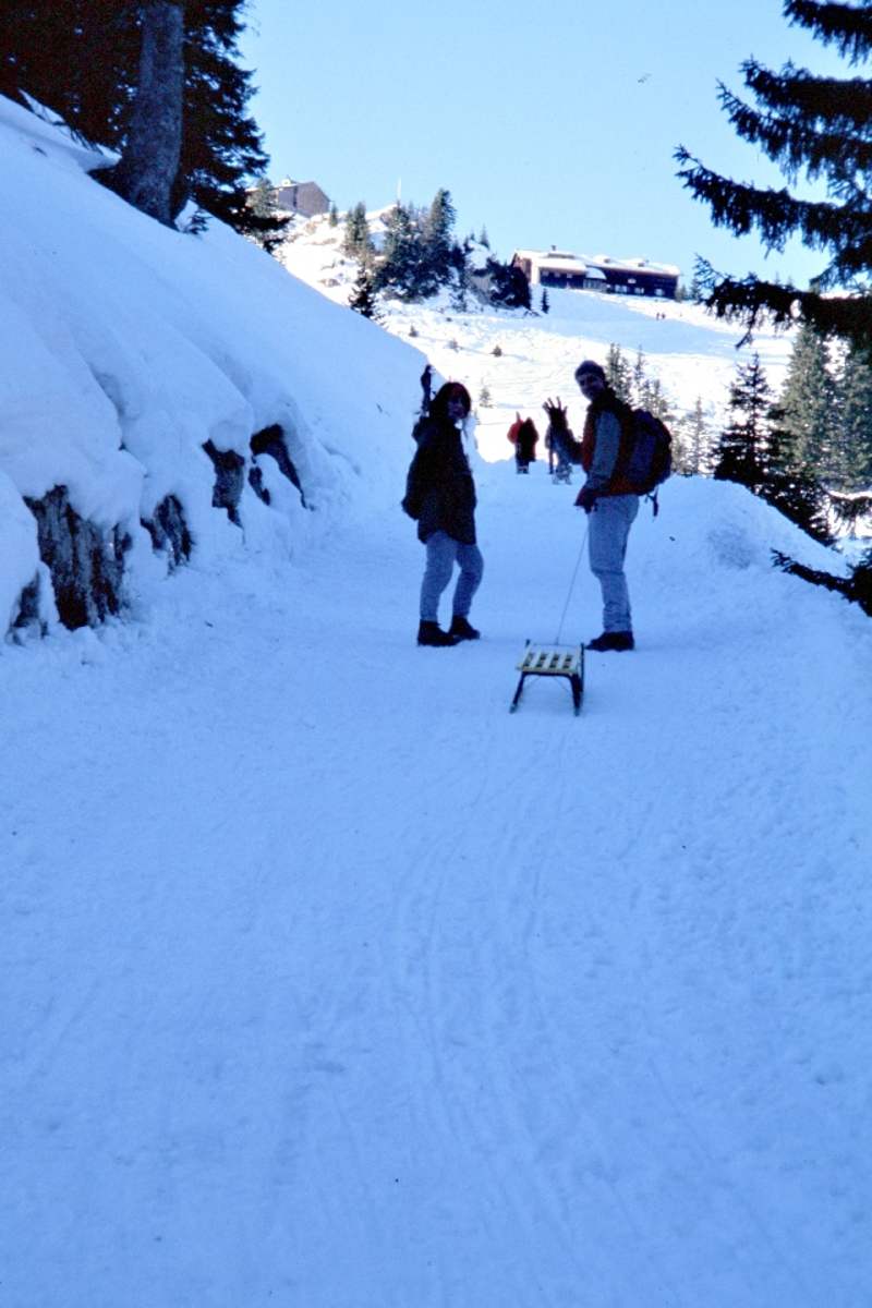 Den Wegweisern nach auf eine Forststraße (= Rodelbahn). Nach einer halben Stunde kommt man zu einer Verzweigung. Wer’s gemütlich mag, geht hier geradeaus weiter, ansonsten kann man über einen steilen Weg nach links hinauf abkürzen – aber besser nicht bei vereister Strecke.