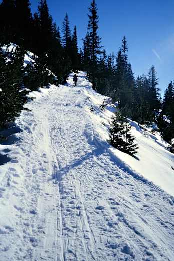 Zu Fuß auf der Straße weiter Richtung Wiesenhof gehen und kurz vor der Gaststätte bergwärts (nach links) zum Pleisenhütten-Anstieg (= Rodelbahn) abbiegen. Für Gäste des Wiesenhofes ist die Zufahrt zum Gasthof gestattet. Im unteren Teil verläuft diese inoffizielle Rodelbahn entlang eines meist geräumten kurvenreichen Fahrweges, im oberen Teil über einen schmaleren Fußweg, der aber gut mit der Rodel befahrbar ist. Der Rodelspaß hängt aber von den jeweiligen Verhältnissen ab, da diese Bahn nicht speziell präpariert oder gewartet wird - ein rustikales Rodelvergnügen.