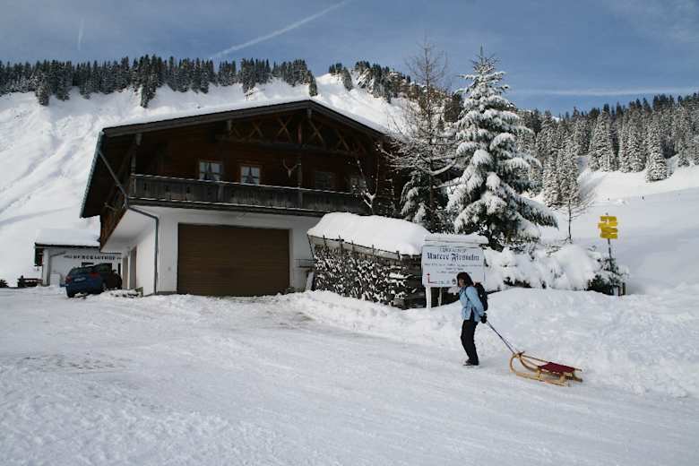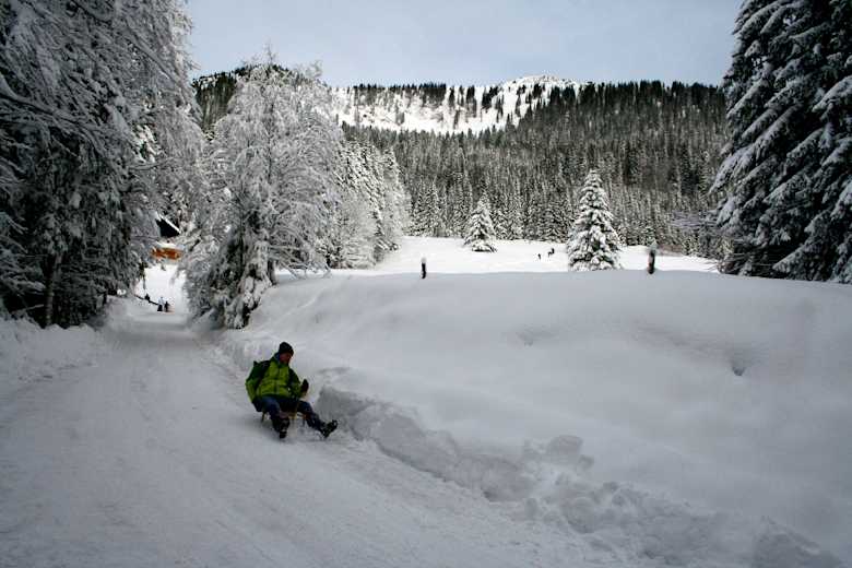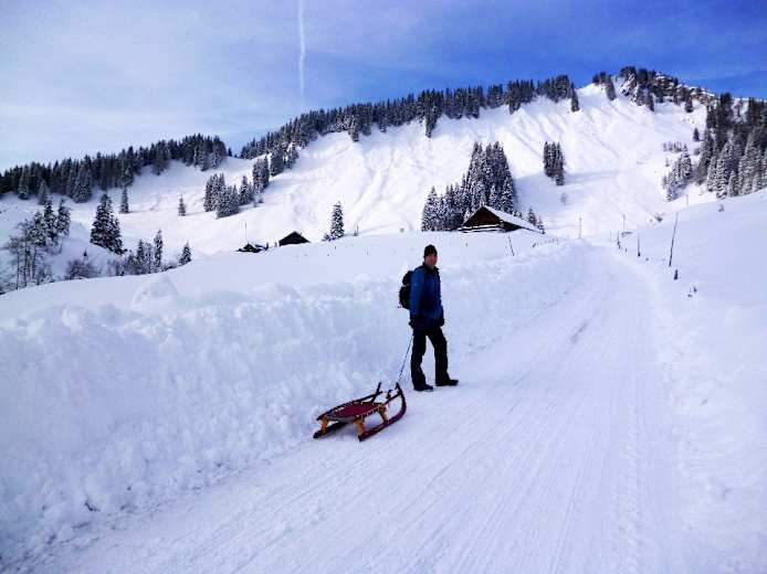 Da die Rodelbahn recht flach ist, muss der Schlitten öfters mal gezogen werden. Die Abfahrt erfolgt auf der selben Strecke.