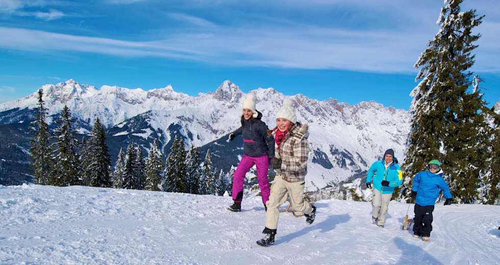 Besonders schöne, breite und daher einfache Rodelbahn oberhalb von Maria Alm am Fuße des Steinernen Meeres. Besonders Familien mit Kinder schätzen diese gemäßigte Rodelstrecke mit geringem Aufstieg in den Berchtesgadener Alpen im Salzburger Land.
