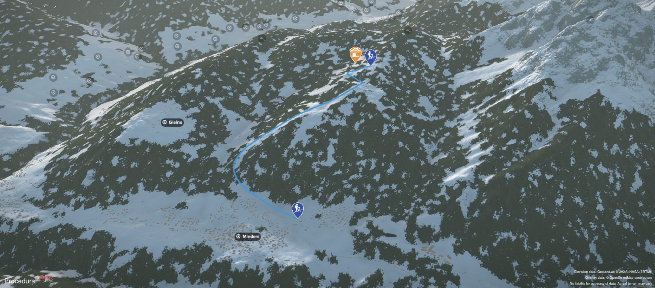 Ausgangspunkt ist die Talstation in Mieders. Man geht entlang der Skipiste zur Schlepplift-Bergstation oder zum Gasthof Koppeneck. Von der Bergstation des Schleppliftes geht es ca. 30 Hm über die Piste hinunter. Weiter einige Schritte hinauf zur Höhenloipe und über diese zur Ochsenhütte. Vor der Ochsenhütte geht es rechts über die Skipiste zur Bergstation des Schleppliftes. Man folgt dem Winterweg bis zur Wegtafel „Gleinser Jöchl“. Kurz geht es durch den Wald bis zu einer Forststraße. Man überquert diese und steigt neuerlich durch den Wald entlang des Sommerweges zum Waldraster Jöchl auf. Abfahrt über die Nordostschneise bis zur Höhenloipe und weiter bis zur Ochsenalm. Weiter über die Skipiste bis ins Tal.