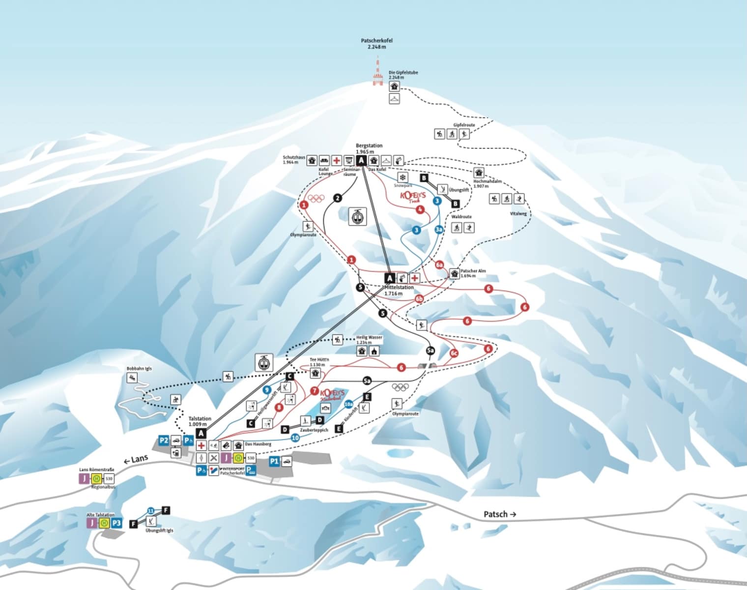 Die Olympiaroute führt über 956 Höhenmetern von der Talstation der Patscherkofelbahn über die Piste bis zur Bergstation. Dort kann man entweder im Patscherkofelhaus oder im Bergrestaurant „Das Kofel“ der Patscherkofelbahnen einkehren.