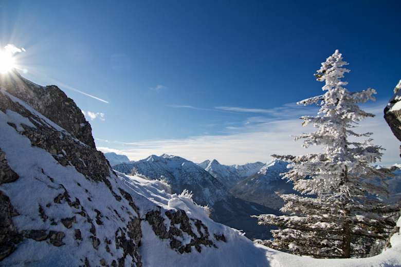 Aussichtsreiche Skitour in der Zugspitzregion in Bayern: Diese anspruchsvolle Kombinationstour bei der der Anstieg sowohl über die Skipiste als auch über freies Gelände erfolgt, gehört zu den Klassikern in den Ammergauer Alpen.