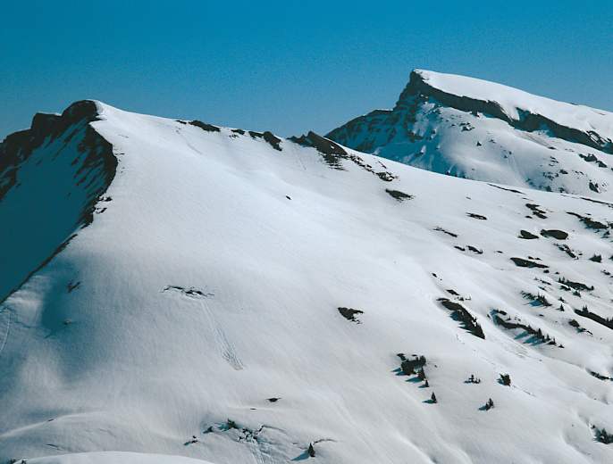 Über die folgenden, sehr schönen, freien Südhänge steigt man erst gerade aufwärts, hält sich dann mehr nach links, um schließlich über den obersten Südwestgrat den Gipfel zu erreichen.