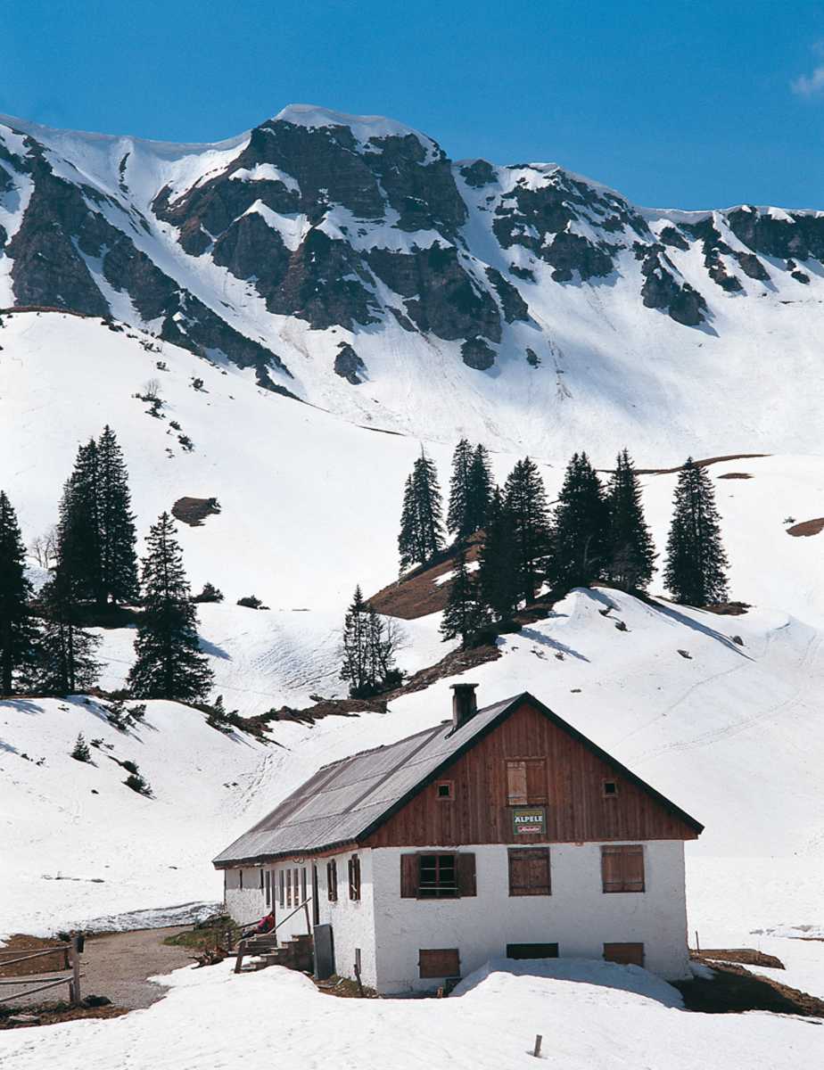 Vom Parkplatz nützt man anfangs die Loipe und wandert links der Häuser von Wiesle sanft aufwärts, bis man auf eine Forst- und Almstraße trifft. Auf ihr steigt man ins Älpeletal hinauf und weiter zum Älpele (1.526 m) in einem weiten, schon ganz freien Tal.