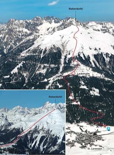 Man folgt dem gewalzten Forstweg bergwärts bis zu den ersten, in den Wald führenden Abkürzungen gelangt. Über diese, die wie Straße mehrmals kreuzend, aufwärts zur aussichtsreichen Lackenalm (1.614 m). Die Spur führt nun weiter in mäßiger Steigung nach Norden zum Lackenkreuz (1.703 m), wo man nur kurz über den Sommerweg nach Westen marschiert. Nach ca. 100 Metern quert man nicht mehr weiter, sondern steigt nach Norden über freies Steilgelände in ansprechenden Spitzkehren bergwärts (Lawinengefahr). Dieser bis zu 40°steile Südhang wird nicht mehr verlassen und führt geradewegs, unterbrochen von einem Flachstück, zum Gipfel des Riebenkofels mit nettem Holzkreuz. Achtung Lawinengefahr in der Südflanke beachten!