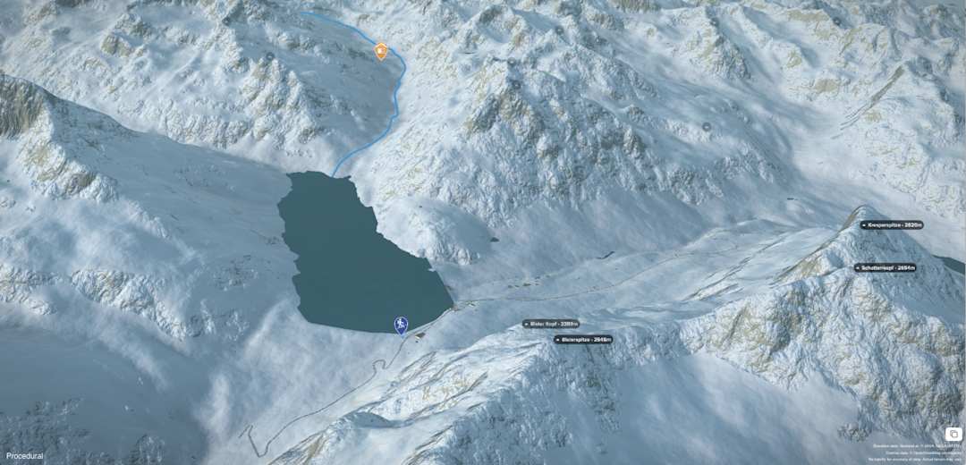 Die Tour beginnt beim Berggasthof Piz Buin auf der Bielerhöhe am zugefrorenen Silvretta-Stausee. Der Weg über den zugefrorenen See ist gesperrt und lebensgefährlich. Daher wählt man einen der Sommerwege entlang des Ufers des Sees. Links entlang des Sees ist das Gelände sanfter und daher ist dieser Weg der sicherere.