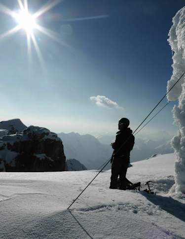 Danach öffnet sich das Gelände und zieht leicht nach rechts hinauf bis zum Eisklammjoch (2.625 m). Oben angekommen, wird man mit warmen Sonnenstrahlen und einem herrlichen Ausblick belohnt. Hier befindet sich auch das Skidepot und der Beginn der Kletterpassagen. Vom Skidepot aus auf der Südseite den Fels entlang absteigen und nach rechts in Richtung Westen queren. Vorbei am zweiten Eisklammjoch trifft man auf eine, östlich ausgerichtete Rinne, die nach oben führt.