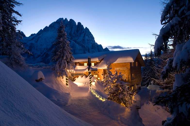 Die Dolomitenhütte auf 1.616 m liegt ganz spektakulär auf einem hohen Felsen mit herrlichem Ausblick auf die umliegende Bergwelt. Diese Lage hat ihr auch den Namen "Adlerhorst" eingebracht. Durch ihre leichte Erreichbarkeit ist sie idealer Aus- und Stützpunkt für Touren aller Art im Sommer wie im Winter