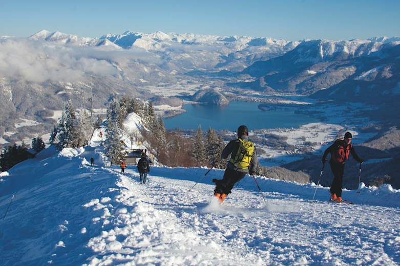 Skitour von St. Gilgen auf das Zwölferhorn (1.521 m): Direkter Start ins Skitourenvergnügen wird dem geboten, der sich das Zwölferhorn in den Salzkammergut-Bergen als Ziel ausgesucht hat. Der begehrte Aussichtsberg im Salzkammergut ist immer sehr gut frequentiert, hier trifft der Tourenskisportler Gleichgesinnte vor allem auch aus dem Raum Bayern und Oberösterreich.
