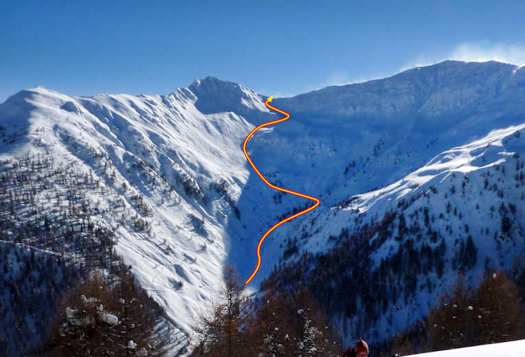 Unterhalb dieses Sattels wird ein kleiner Boden durchschritten, bevor der Gipfel in wenigen Spitzkehren erreicht wird. Hier muss man unbedingt auf die vorherrschenden Verhältnisse achten. Zu Beginn leicht links vom Kamm in südwestlicher Richtung zum höchsten Punkt steigen.