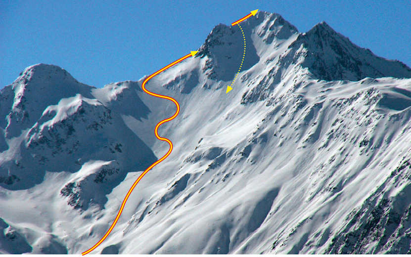 Der dort ansetzende, steile Grataufschwung wird mit einer oft abgeblasenen Querung in die Südseite umgangen, wo ein kurzer Hang in die oberste Scharte unter dem Gipfelkreuz führt (Skidepot, Einfahrt Nordflanke). Die letzten Meter zum Gipfel ohne Ski.