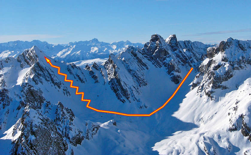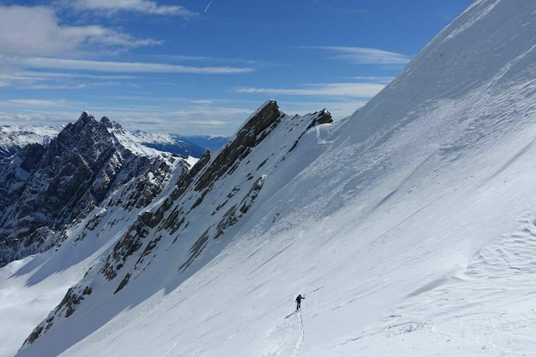 Auffallend ist die „Fels-Warze“, etwa 100 Hm oberhalb. Unter dieser geht es, je nach Verhältnissen mit oder ohne Steigeisen, die Ski tragend links vorbei. Eine ansteigende Querung führt zum kurzen, schmalen Ostgrat links vom Gipfel. Achtung: Dieser Teil ist kammnah und oftmals mehr eingeblasen als die restliche Wand. Über den Grat unschwierig in wenigen Schritten zum höchsten Punkt.