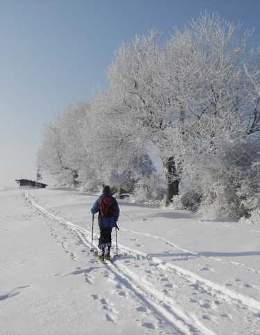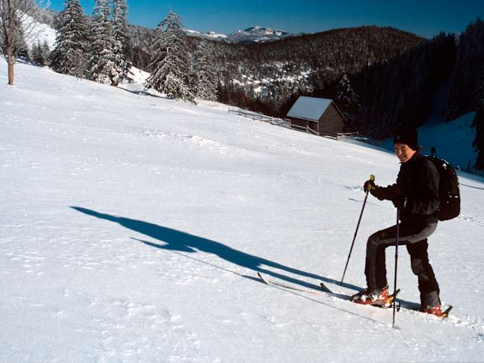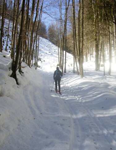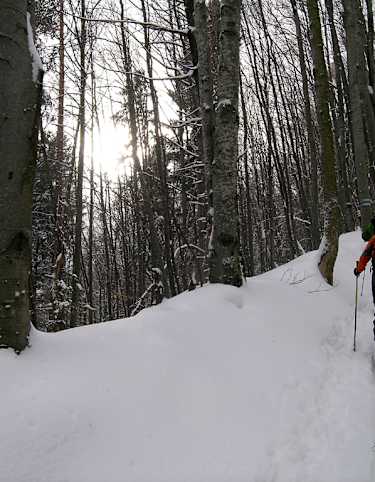 Bei guter Schneelage nach der langgestreckten Lichtung weiter direkt nach Süden durch ein dichteres Waldstück, dann auf der Wiese zum Ortbauer.