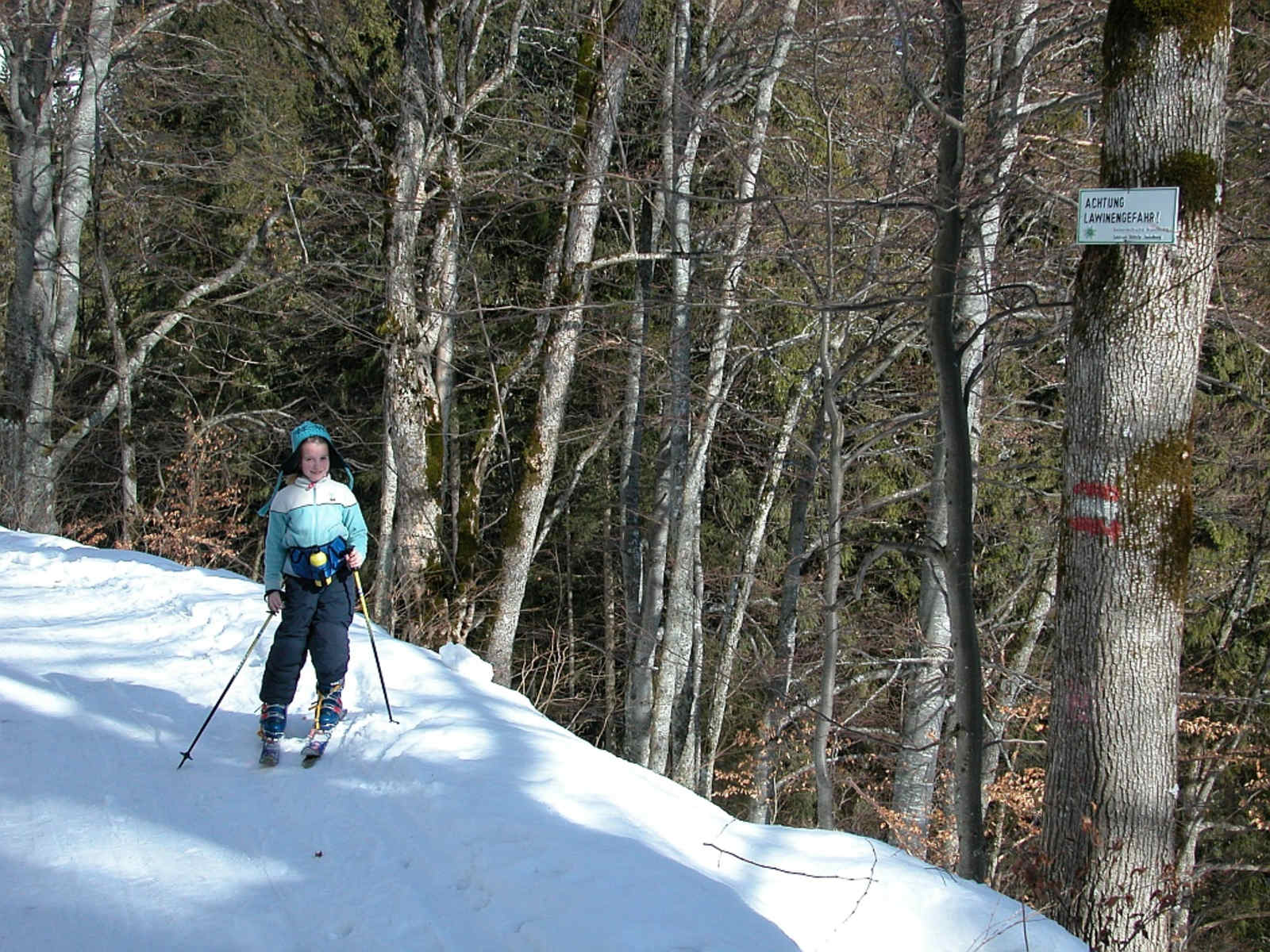 Nach dem Kreuz links und auf dem Weg weiter nach Osten über die Lichtung in den Wald. Bald folgt links ein großer Schlag (ehem. Abfahrtsvariante vom Ahornberg), dann eine Linkskurve um einen Rücken (Lawinenwarnschild) und Querung eines sehr steilen felsdurchsetzten Waldhanges.