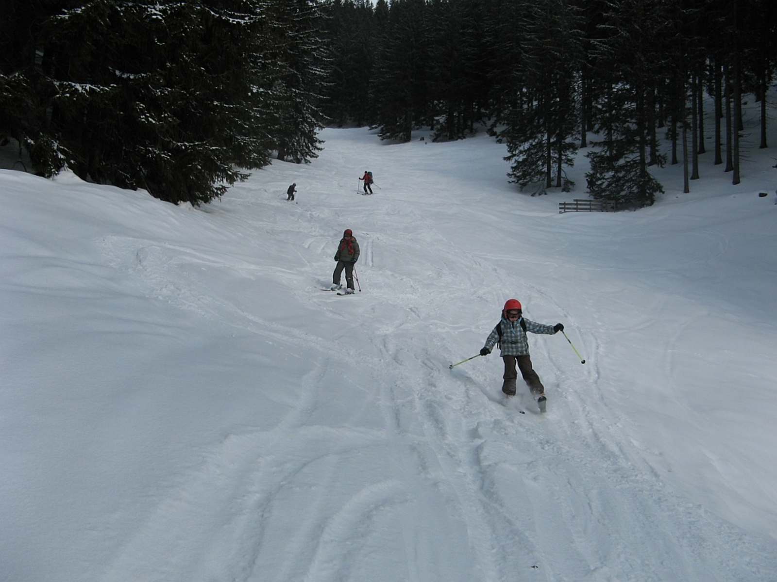 Dort links durch eine schöne Mulde (Einwehungen und Wechten kann leicht ausgewichen werden), die Forststraße kreuzen, dann vor dem Wald rechts rausqueren zurück zur Straße und auf dieser wie beim Aufstieg zurück zum Ausgangspunkt.
