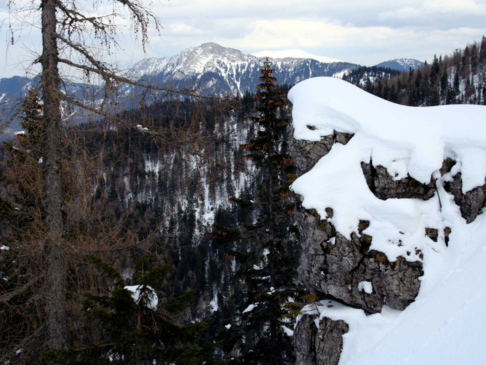Durch dieses bis 1.100 m, dann links raus auf eine freie Fläche und an ihrem linken Rand hinauf zu einer Forststraße. Diese kreuzen und über den Waldrücken zum Hauptkamm, 1.240 m, abfellen (Gegensteigung 0,5 h).