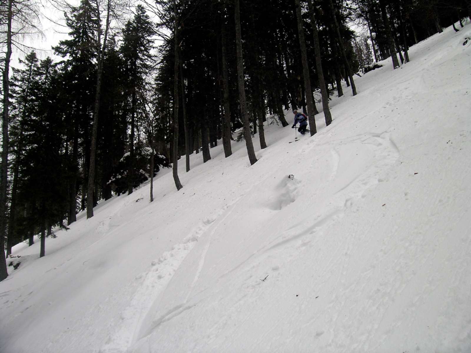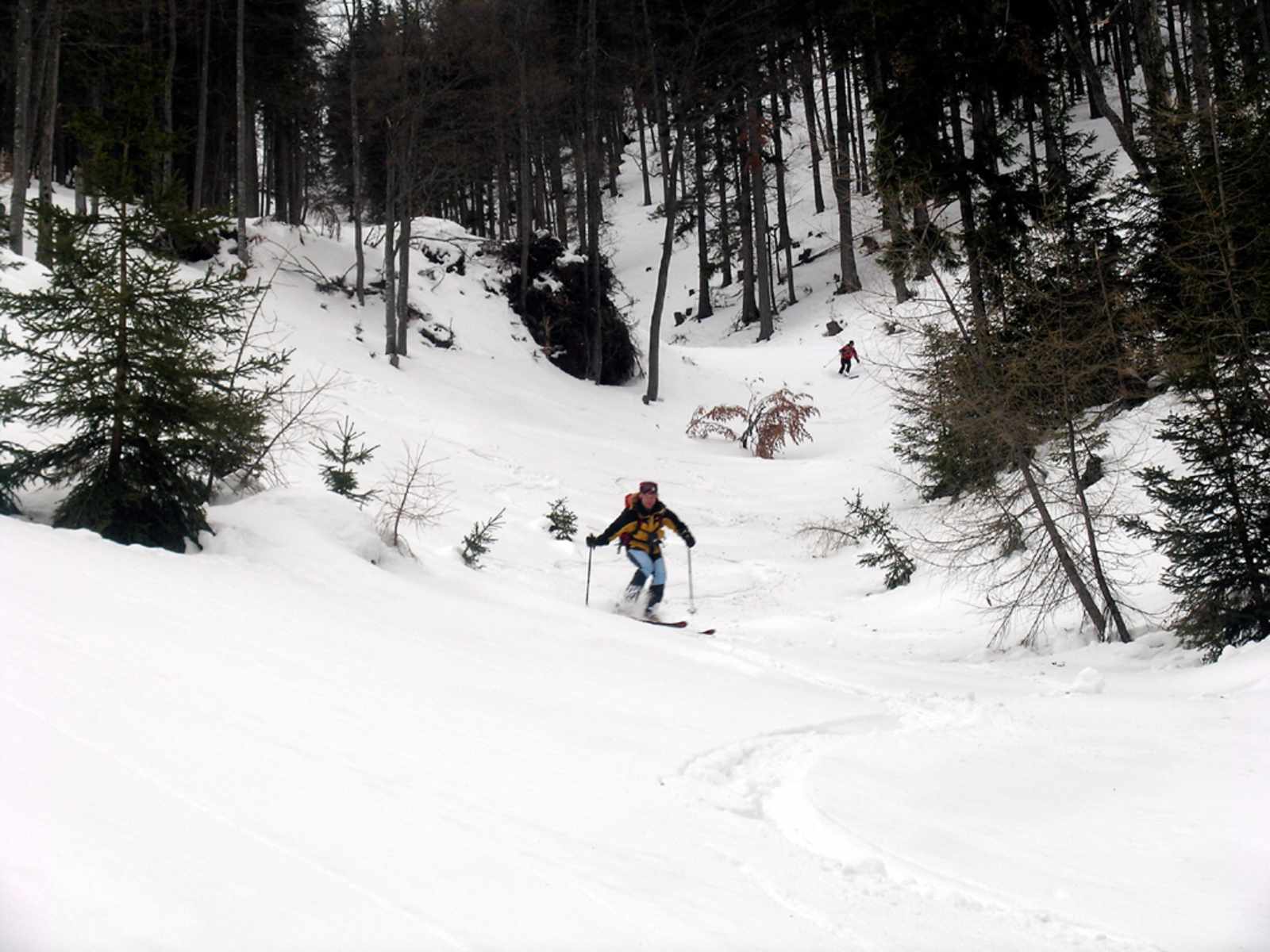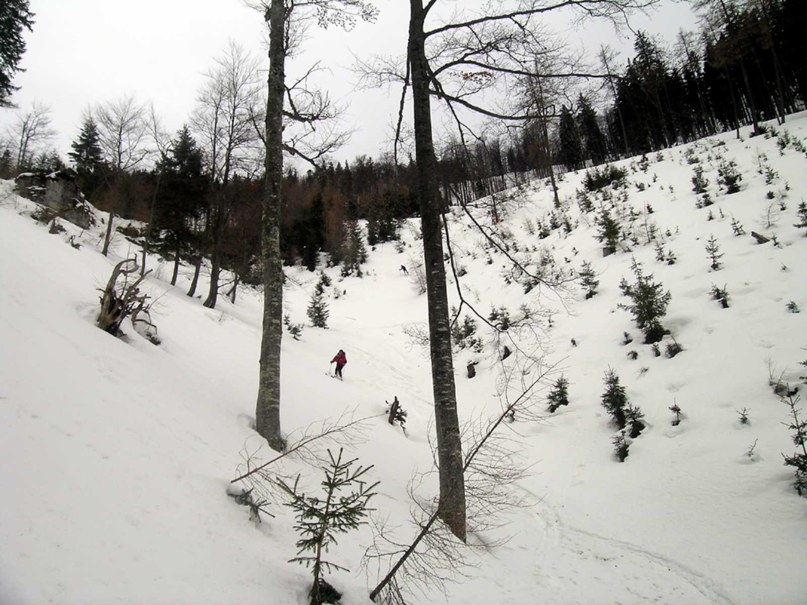 Der Aufstiegsspur entlang bis 1.160 m abfahren. Dort nach links einen lichten Waldhang hinab, dann links auf einen schmalen Rücken. Genau diesem folgen (nicht rechts in den Graben) und nach einer kurzen Steilstufe in den Göllergraben.