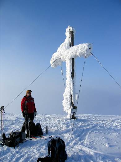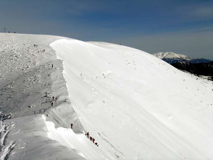 Auf der Gipfelfläche nach Nordost, dann nach Ost in einen nahen Sattel (Wechten) und jenseits der letzte Anstieg zum großen Kreuz auf dem weitläufigen Gipfelplateau des Göllers auf 1.766 m. 2,25 h