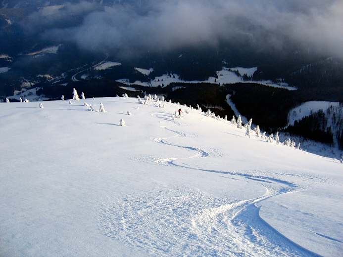 Eine der beliebtesten Früjahres-Steilabfahrten am Göller (1.766 m) in den Mürzsteger Alpen mit einem bequemen kürzeren Zustieg.