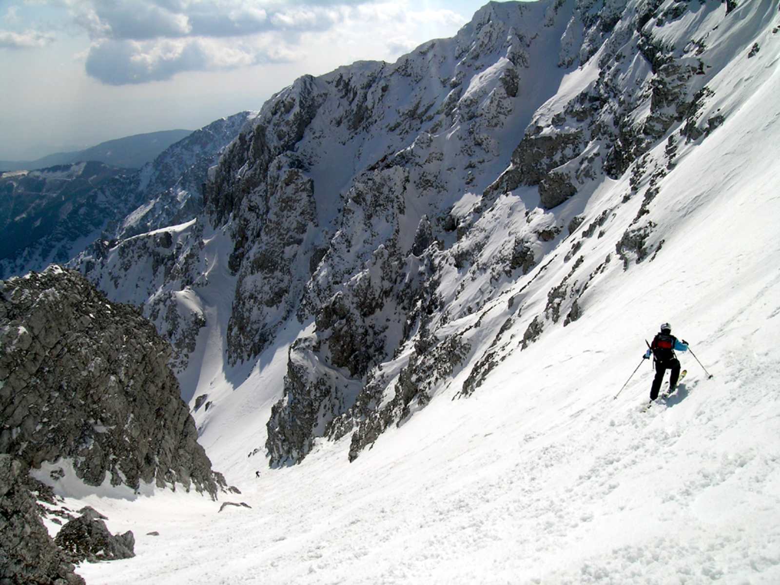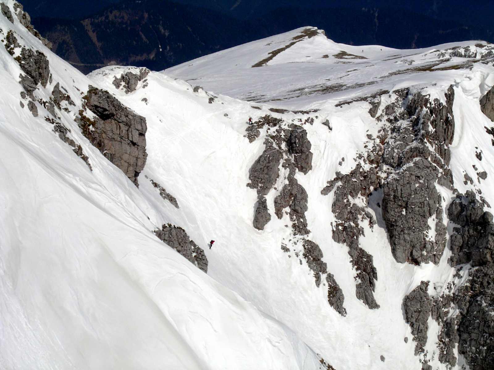 Zur üblichen Einfahrt ein wenig weiter in einen seichten Sattel, 2.000 m. Schrägfahrt in die steile Rinne und durch sie tiefer.