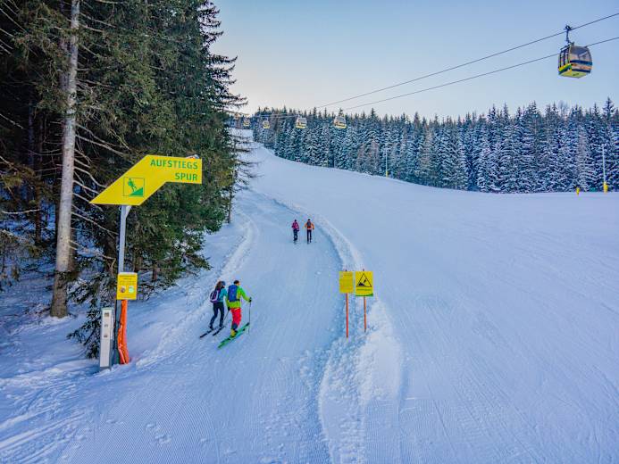 Der Aufstieg zwischen 17:00 und 19:00 Uhr ist über die Piste 32, einen Teil der Piste 33 und 31 laut ausgeschilderter Aufstiegsroute gestattet (lila-strichlierte Linie im Pistenplan).