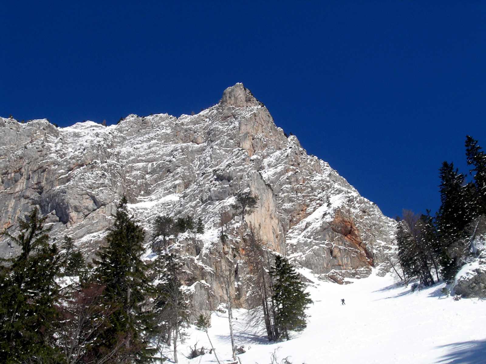 Nun nach Osten zunehmend steil in den so genannten Juliengraben, zunächst im Wald, dann in der offenen Rinne, links oberhalb zunehmend bedrohlich die Felsen der Roten Wand. Unter den Wänden (oder rechts im steilen Hochwald) in zahlreichen Spitzkehren höher, zuletzt steil zwischen Bäumen raus zur gelben Markierung des Grafensteigs und nach Nordosten zur nahen Heinrich-Krempel-Hütte. 1,5 h
